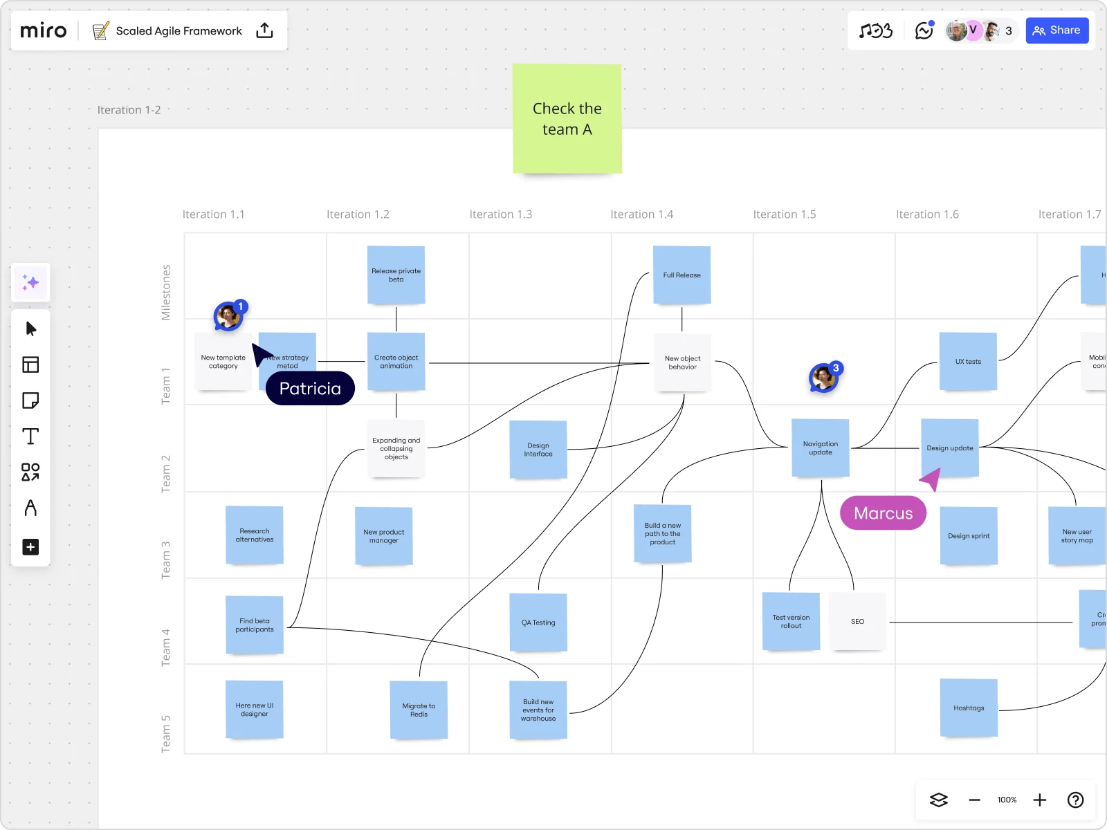 Yes. When choosing a Scaled Agile Framework software, it’s important to pick a tool that supports key SAFe events like PI Planning. With Miro, you can easily kickstart a PI Planning session using one of many customizable templates or build your own PI planning boards using Miro’s intuitive SAFe tools. Miro has also built dedicated features to streamline and accelerate your team’s PI Planning.