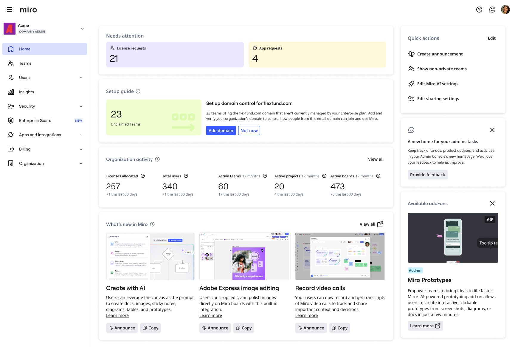 This year we launched your new mission control: Admin Home. See license requests and usage stats at a glance, take quick action without digging through menus, and keep tabs on the latest Miro features so you always know what’s new for your teams. All from one dashboard. Thanks for everything you do, admins!