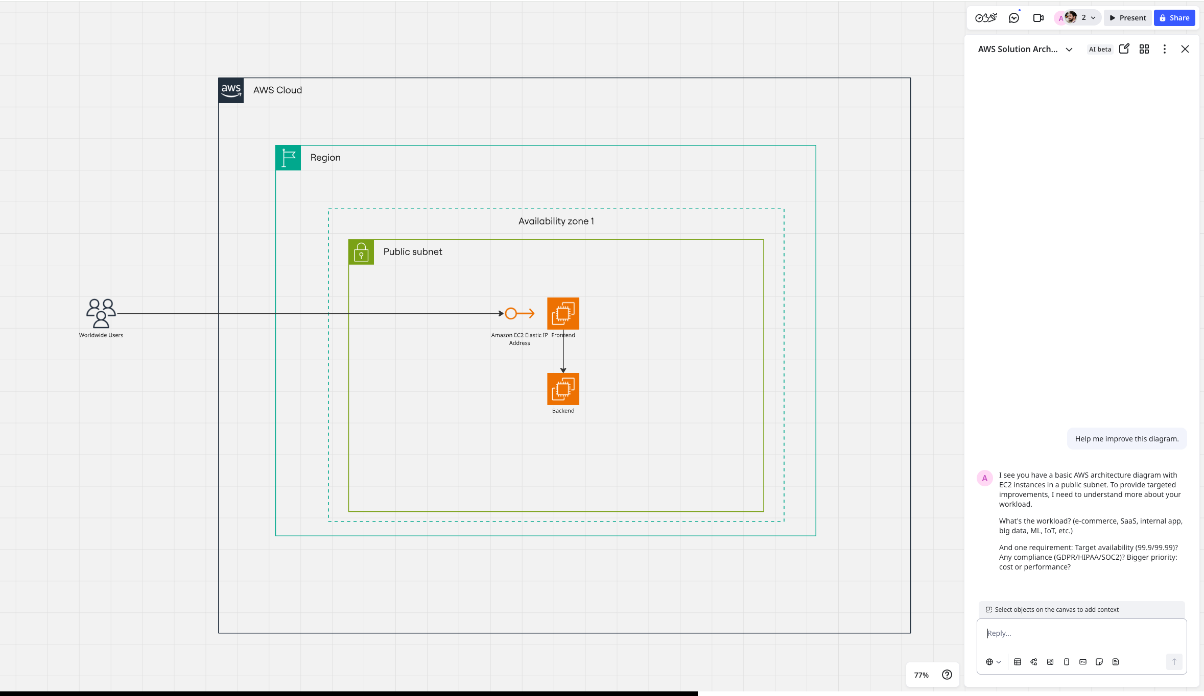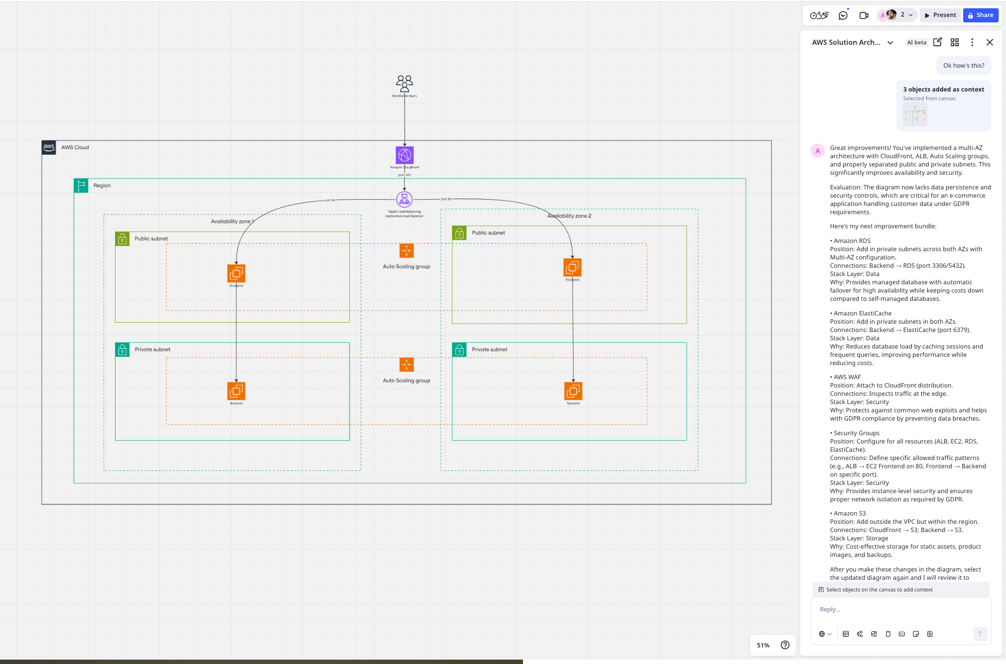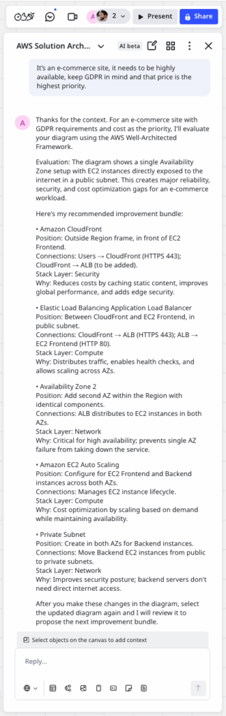 - AWS Solution Architecture Sidekick: This one examines your AWS diagrams in Miro, asks questions about your goals around availability and resiliency, then recommends improvement packages. Each package includes the services you should add, why you should add them, and where on the diagram to place them (it’ll even recommend layers). The Sidekick tends to put its output in the chat rather than creating new board elements.