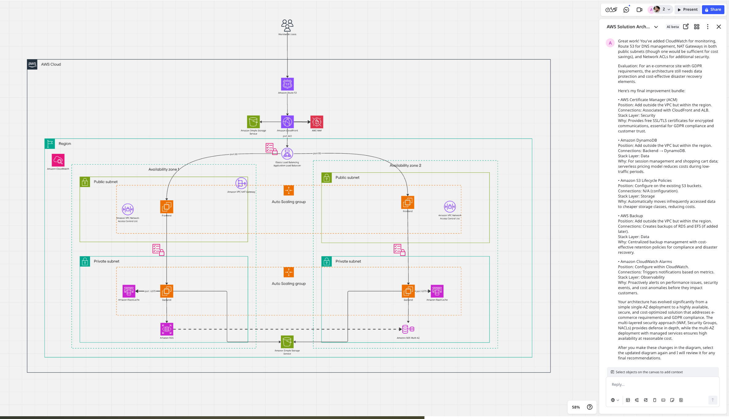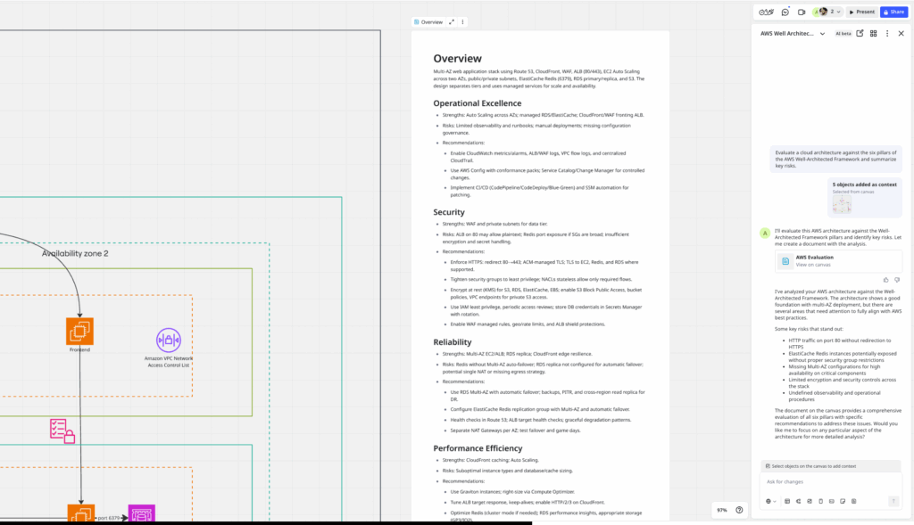 So very quickly, we can diagram, improve our AWS architecture, and validate it against best practices — all in one place. Previously, you’d use multiple tools; copy and paste text and screenshots between them; and struggle to invite your non-AI-savvy colleagues and clients to discuss designs together.