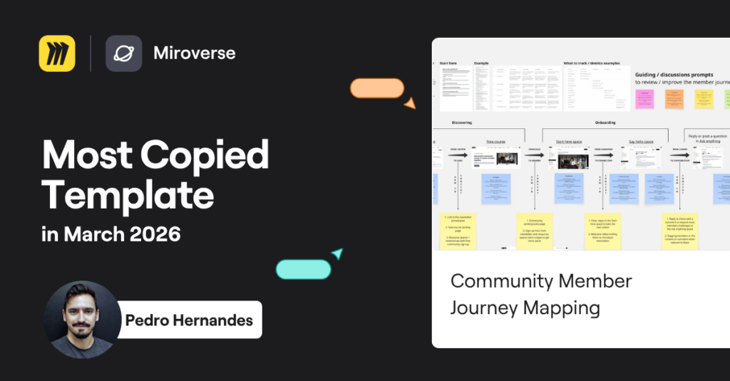 This month’s Most Copied Miroverse Template goes to Pedro Hernandes for the Community Member Journey Mapping template, which was copied 58 times in March alone. Pedro is the Founder at HBFS, where he helps founders, creators, and teams build stronger communities and better member experiences, with a special focus on onboarding, member journeys, engagement, and collaborative workshops.