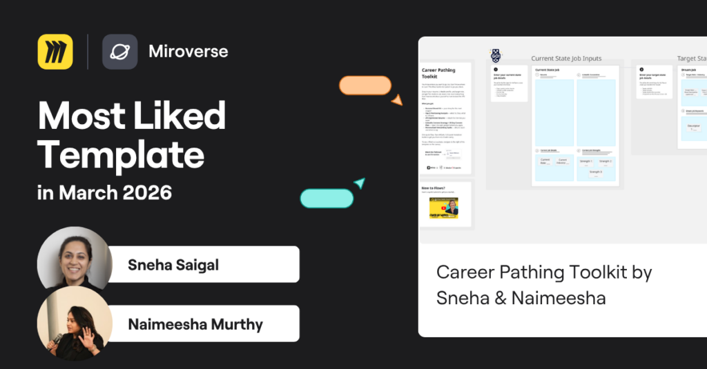 The Most-Liked Miroverse Template in March was the Career Pathing Toolkit by Sneha and Naimeesha. The template uses Miro Flows to clarify career growth by turning aspirations into concrete next steps. It uses your context to build personalized artifacts, including an ATS-optimized resume, LinkedIn glow-up recommendations, networking plan, and more.