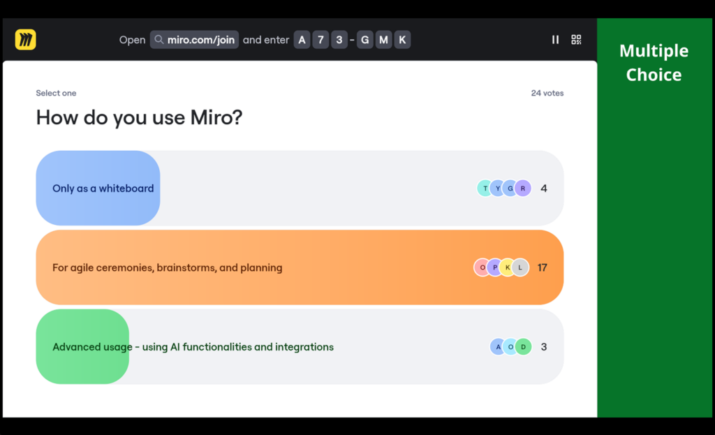 - Miro Engage for live polls and activities via QR codes that allow 100 attendees to participate instantly from their phones without logging in or taking a training