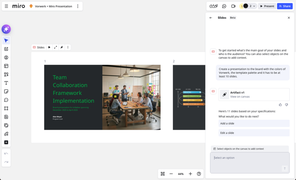 - Miro Slides for storytelling and presenting collaborative AI workflows