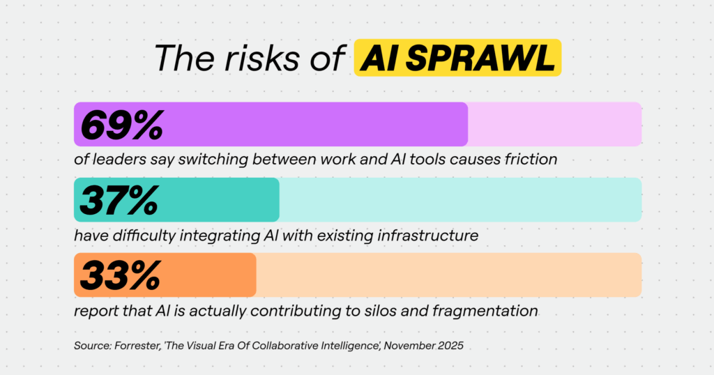 That’s not all: 33% told us that AI is actually contributing to silos and fragmentation. The conclusion? We’re piling AI sprawl on top of existing tool sprawl.