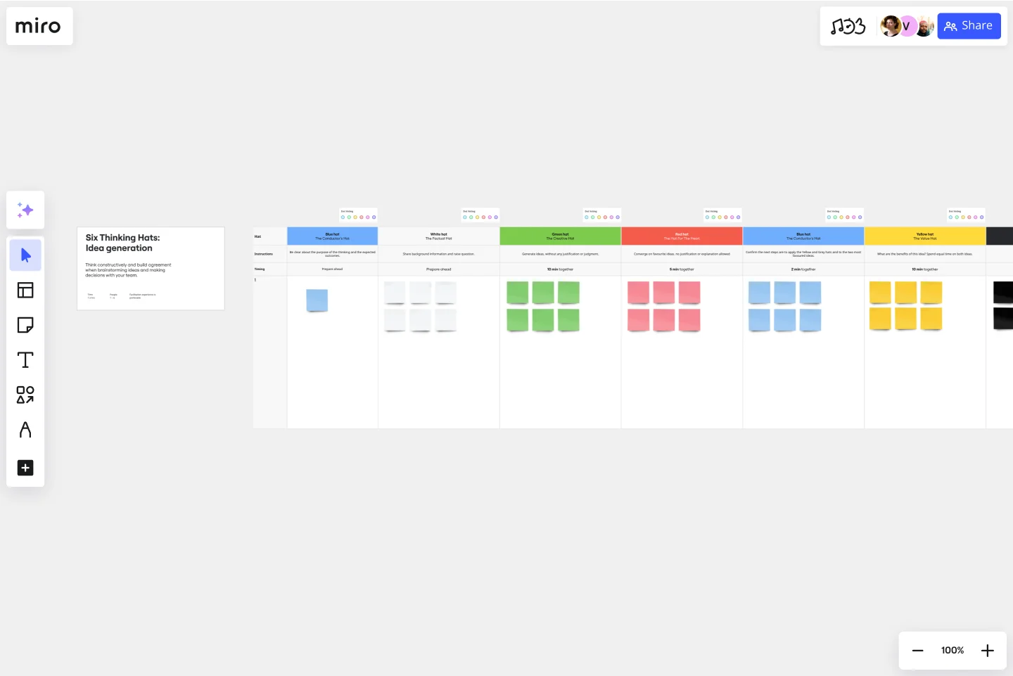 Miro’s collaborative features make it easy to switch between these perspectives and capture input in real-time. Teams can use color-coded sticky notes to represent each “hats” perspective, keeping the process visual and engaging.