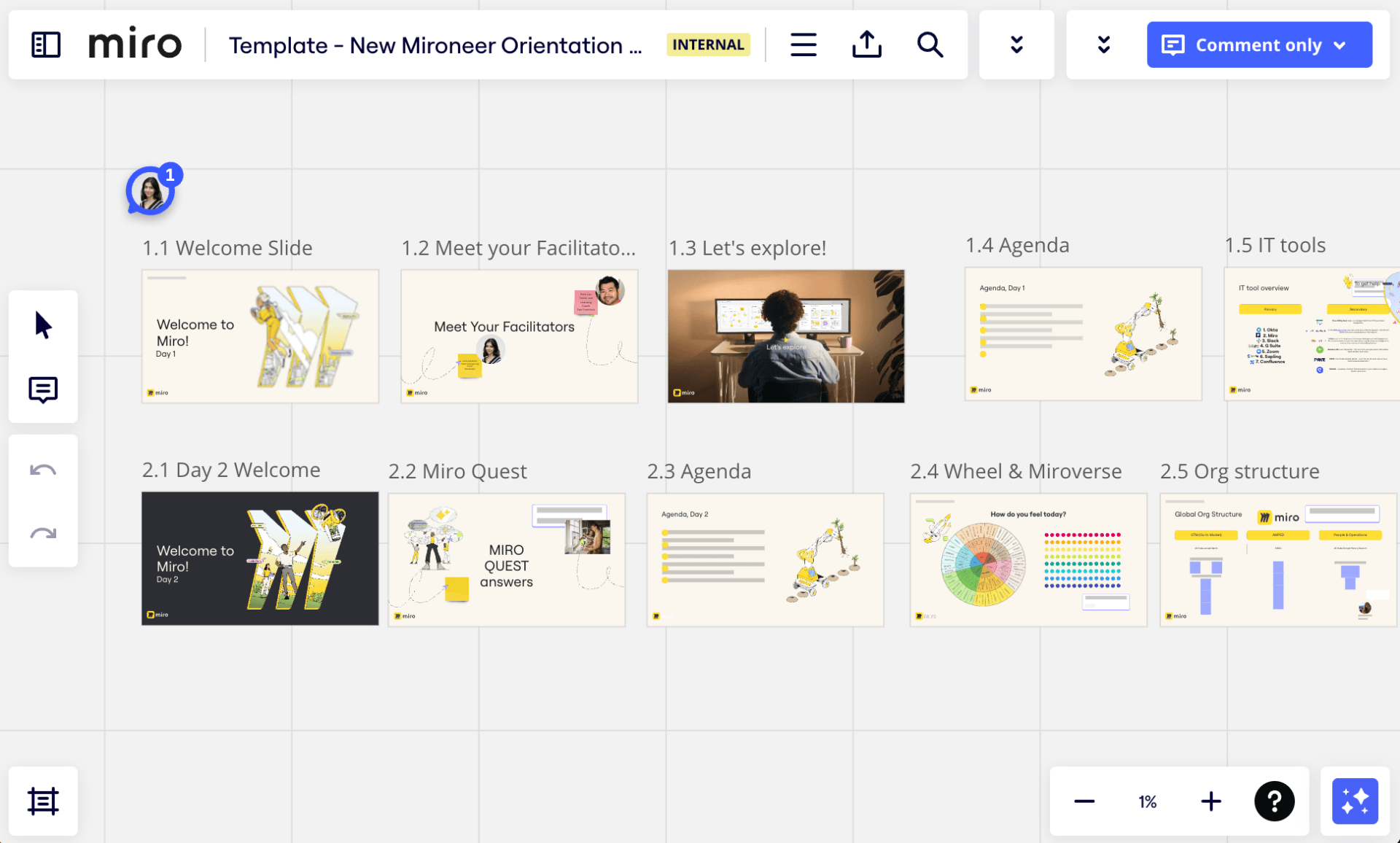 To be successful and feel integrated into the organization, new team members need a detailed, attentive, and inclusive onboarding experience. Every new Mironeer is put into a cohort with other new starters, where they go through a series of onboarding sessions.This process as a whole reflects Miro values: the cohort and interactive sessions are a collaborative time experience in miniature. In these sessions, they learn: