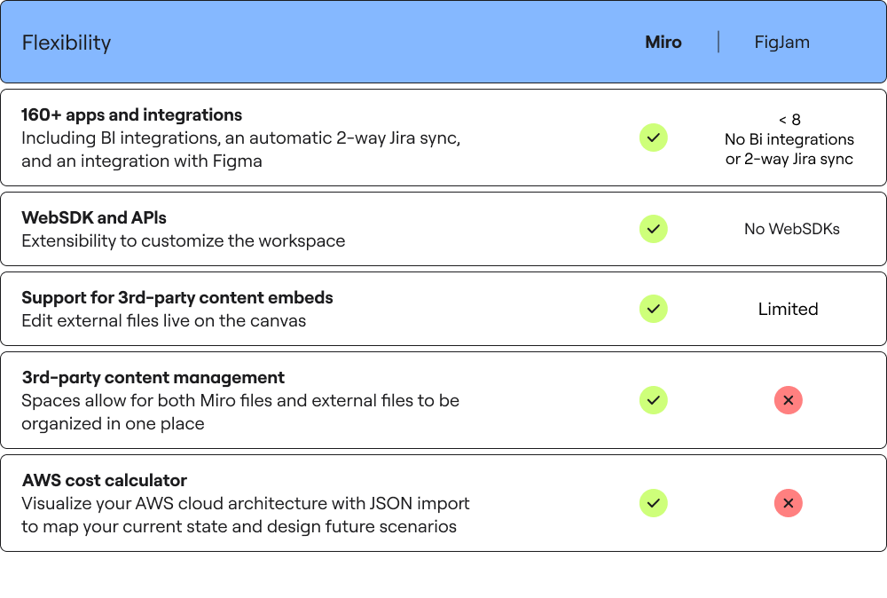 “Figjam is comparable, but ironically not as user friendly/intuitive. The templates aren't as good; they are very finicky if they are submitted by users. There are also a lot of different behaviors that just don't work as smoothly as miro. I've never felt frustrated with what I can't do with Miro, but I have with FigJam.”