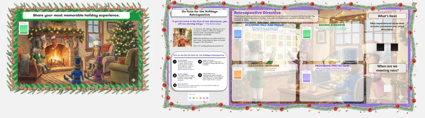 Ob Eisbrecher, Retrospektiven oder Design Sprints – hier können sich alle persönlich einbringen. Organisiere Meetings nahtlos und halte alle jederzeit engagiert, um Zusammenarbeit und Verständnis innerhalb deiner Organisation zu fördern.