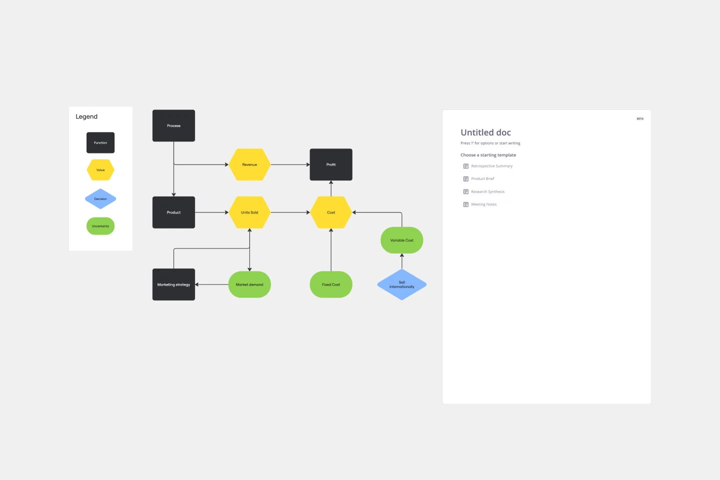 Erhalte das Gesamtbild jeder geschäftlichen Entscheidung mit dieser Einflussdiagramm-Vorlage. Du wirst die Entscheidung, die du treffen musst, definieren und alles brainstormen, was darauf Einfluss haben könnte. Wenn du Verbindungen zwischen diesen Faktoren herstellst, kannst du jedem den richtigen Stellenwert beimessen, wenn du deine Entscheidung triffst.