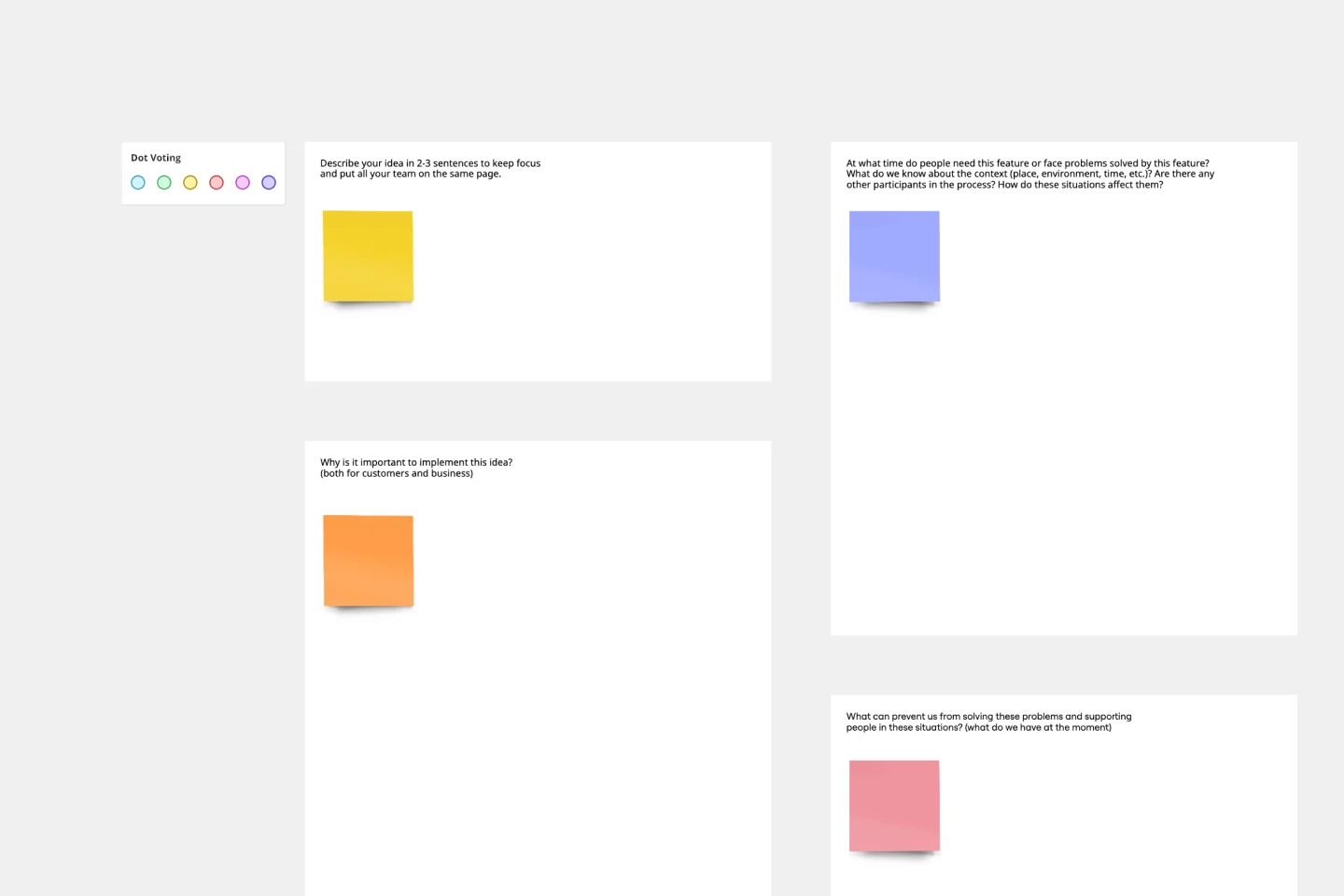 Wenn du an einem neuen Feature arbeitest, das ein Problem deiner Nutzer löst, ist es leicht, sich direkt auf die Lösungsfindung zu stürzen. Es ist jedoch wichtig, zuerst das ursprüngliche Problem des Nutzers zu verstehen. Verwende die Feature-Canvas-Vorlage, um tief in die Probleme der Nutzer, den Kontext, in dem sie dein Feature nutzen werden, und das Wertversprechen, das du deinen Nutzern liefern wirst, einzutauchen. Die Vorlage ermöglicht es dir, mehr Zeit für die Erforschung des Problems zu verwenden, um potenzielle blinde Flecken zu antizipieren, bevor du in den Lösungsmodus übergehst.