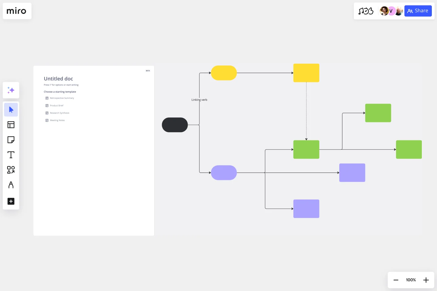 Es exactamente ahí donde la plantilla de sitemap de Miro se vuelve útil. Además de tener una plantilla lista para usar y totalmente personalizable con la que trabajar, también tendrás acceso al espacio de trabajo visual intuitivo de Miro, diseñado para ayudarte a hacer más con menos.