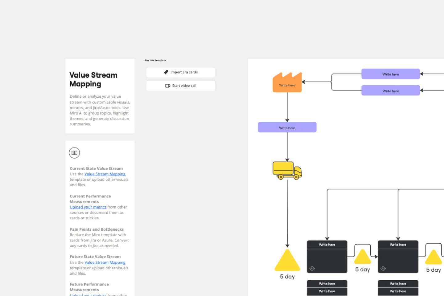 La Plantilla de Mapeo de Flujo de Valor SAFe en Miro está diseñada para ayudar a los equipos a visualizar y optimizar sus flujos de trabajo dentro del Scaled Agile Framework (SAFe). Esta plantilla ofrece un enfoque estructurado para mapear el estado actual de tu flujo de valor, identificar cuellos de botella e ineficiencias, y planificar un estado futuro más eficiente. Al aprovechar esta plantilla, los equipos pueden asegurarse de estar alineados con los principios de SAFe y mejorar continuamente sus procesos.
