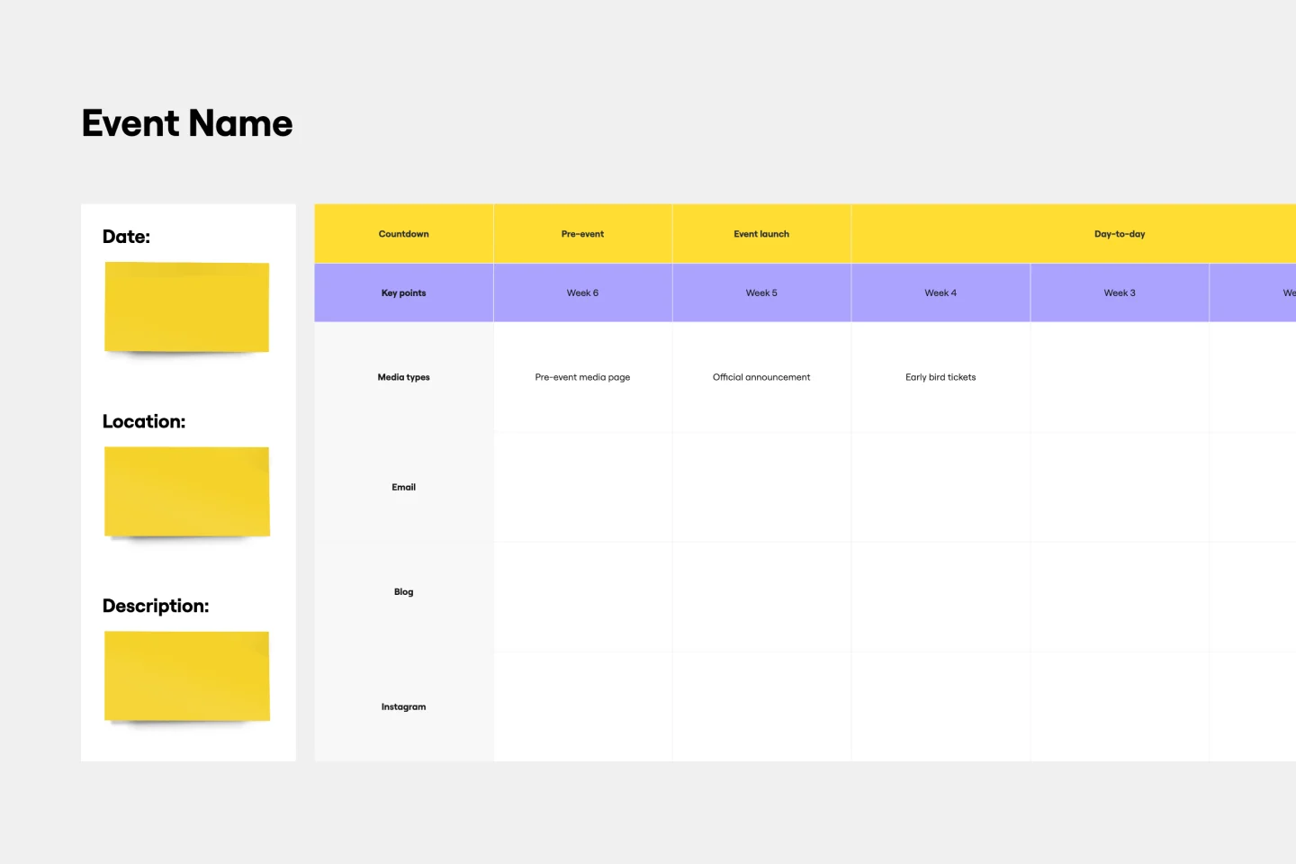 La plantilla de Planificación de Medios es una herramienta integral que ayuda a los profesionales a navegar por las complejidades de la estrategia de medios y la orquestación de eventos. Esta plantilla proporciona un marco estructurado que incluye detalles del evento como la fecha, ubicación y descripción, una cuenta regresiva sistemática para el evento, un desglose de los diversos tipos de medios y canales, y hitos clave para seguir el progreso semana a semana. Una de las ventajas de usar esta plantilla es su diseño fácil de usar, que simplifica el proceso de planificación y asegura que cada aspecto crucial de un evento o campaña de medios esté visualmente representado y sea fácilmente accesible. Esto fomenta la eficiencia y ayuda a asegurar que no se pase por alto ningún detalle crítico.