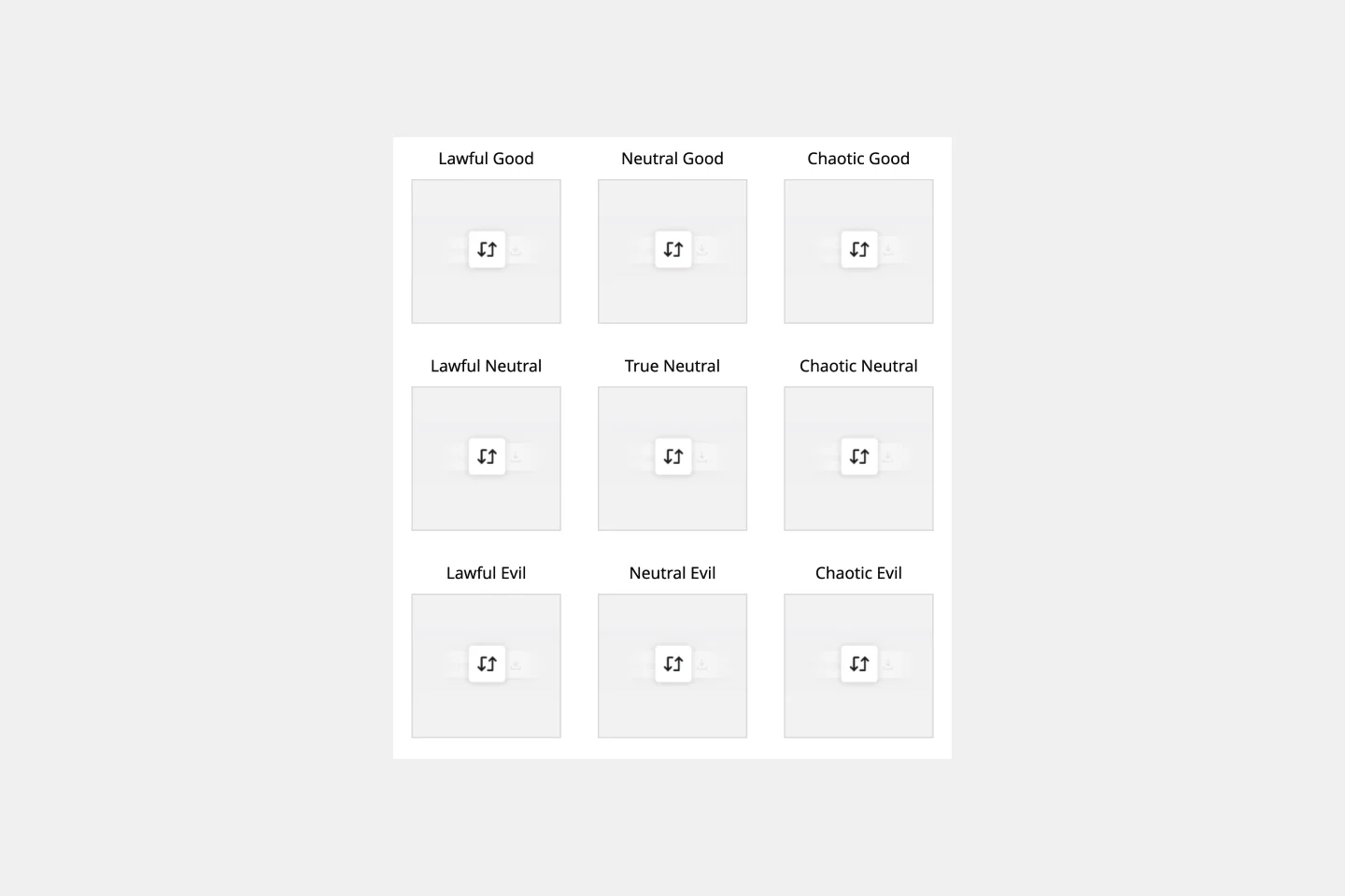 El gráfico de alineación se originó en el juego de rol de fantasía Dungeons & Dragons (D&D) para permitir a los jugadores categorizar a sus personajes según sus perspectivas éticas y morales. Desde entonces, personas de todo el mundo han comenzado a usar el gráfico de alineación como una forma divertida de describir sus propias características y personalidades, así como personajes ficticios, personajes famosos y mucho más. En la configuración convencional, determinas tu posición en el gráfico de alineación basándote en tus puntos de vista sobre la ley, el caos, el bien y el mal. Pero puedes adaptar el gráfico de alineación para reflejar cualquier característica que desees utilizar para crear personajes.