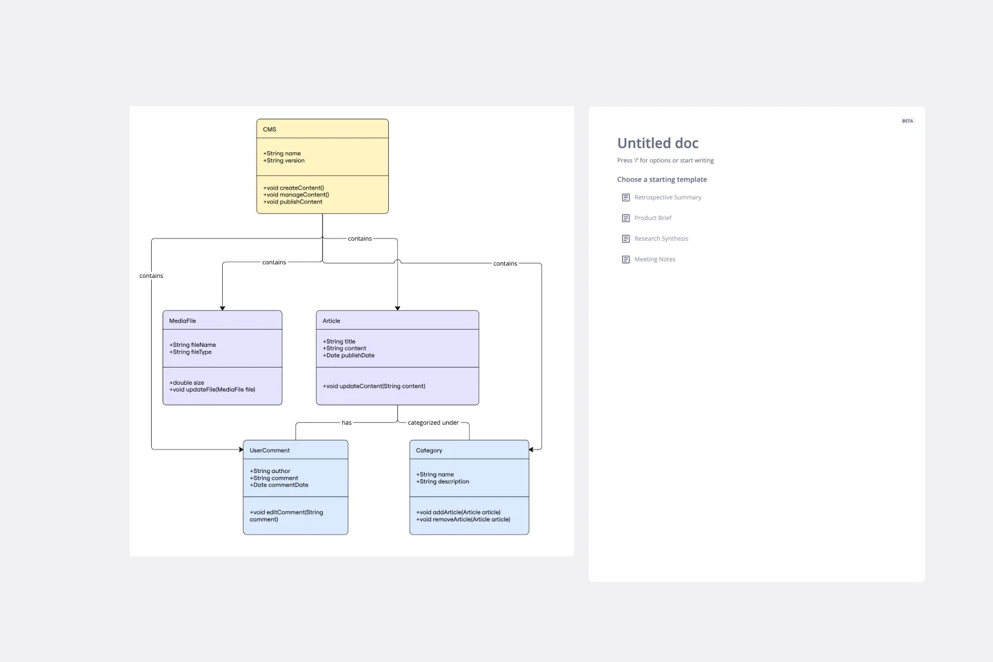 Nuestra colección de plantillas de diagramas UML está diseñada para simplificar el proceso de creación y compartición de diagramas UML aprovechando el conocimiento de nuestra comunidad activa. Ya seas un arquitecto experimentado o nuevo en el diseño de sistemas, nuestra colección ofrece una variedad de plantillas listas para usar para diferentes tipos de diagramas UML. Con Miro, puedes visualizar fácilmente sistemas complejos, colaborar con tu equipo en tiempo real y hacer ediciones directas a tus diagramas en el tablero.
