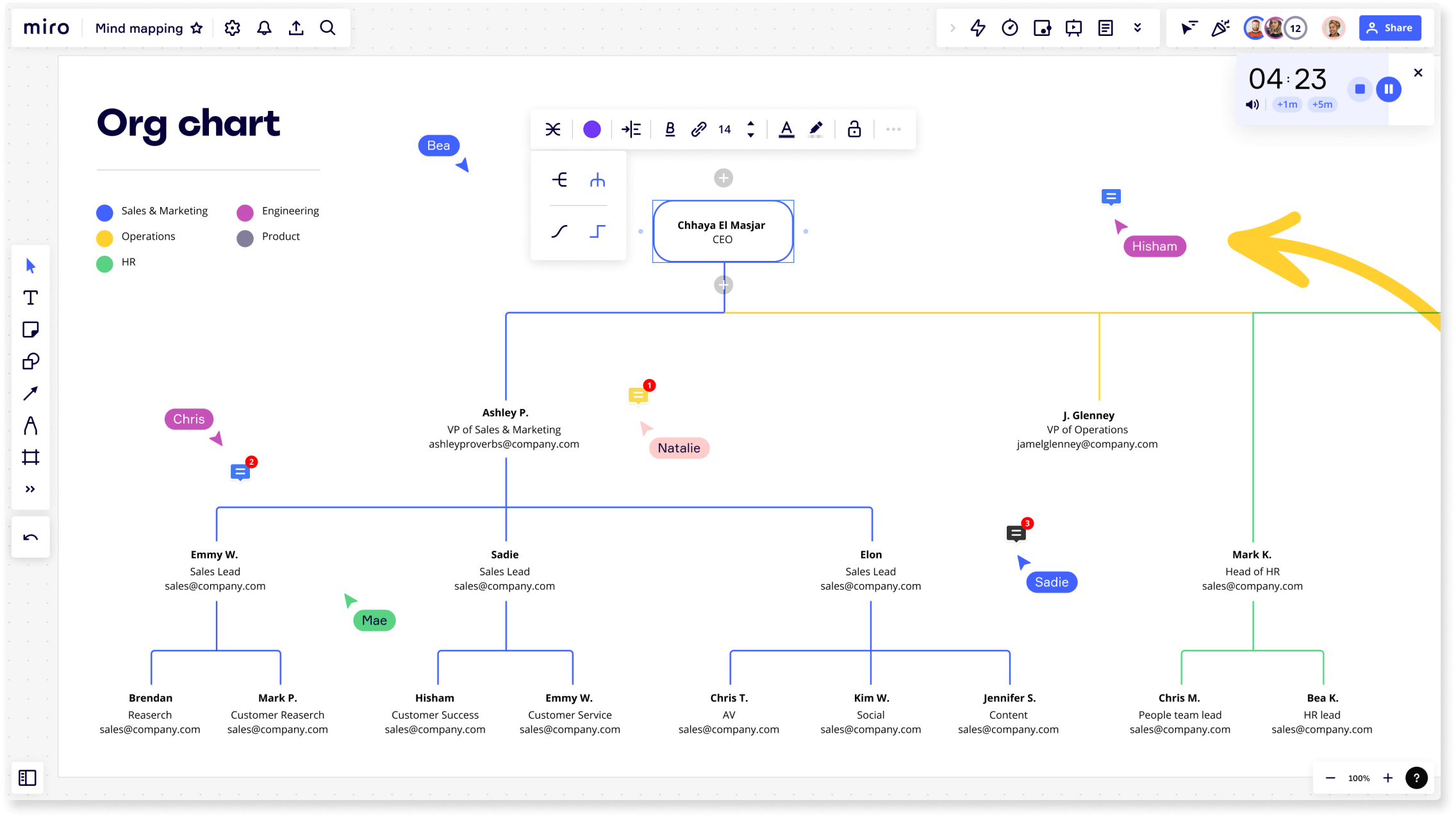 Avec de nouvelles embauches, des mutations internes et la rotation du personnel, il est inévitable que votre organigramme change au fil du temps. Cela signifie qu'il doit constamment être mis à jour, ce qui peut prendre beaucoup de temps. Heureusement, l'utilisation de Miro rend ce processus rapide et facile. Avec nos organigrammes en ligne, vous pouvez mettre à jour les informations de votre entreprise en quelques clics, et vos changements seront instantanément visibles pour le reste de l'entreprise.