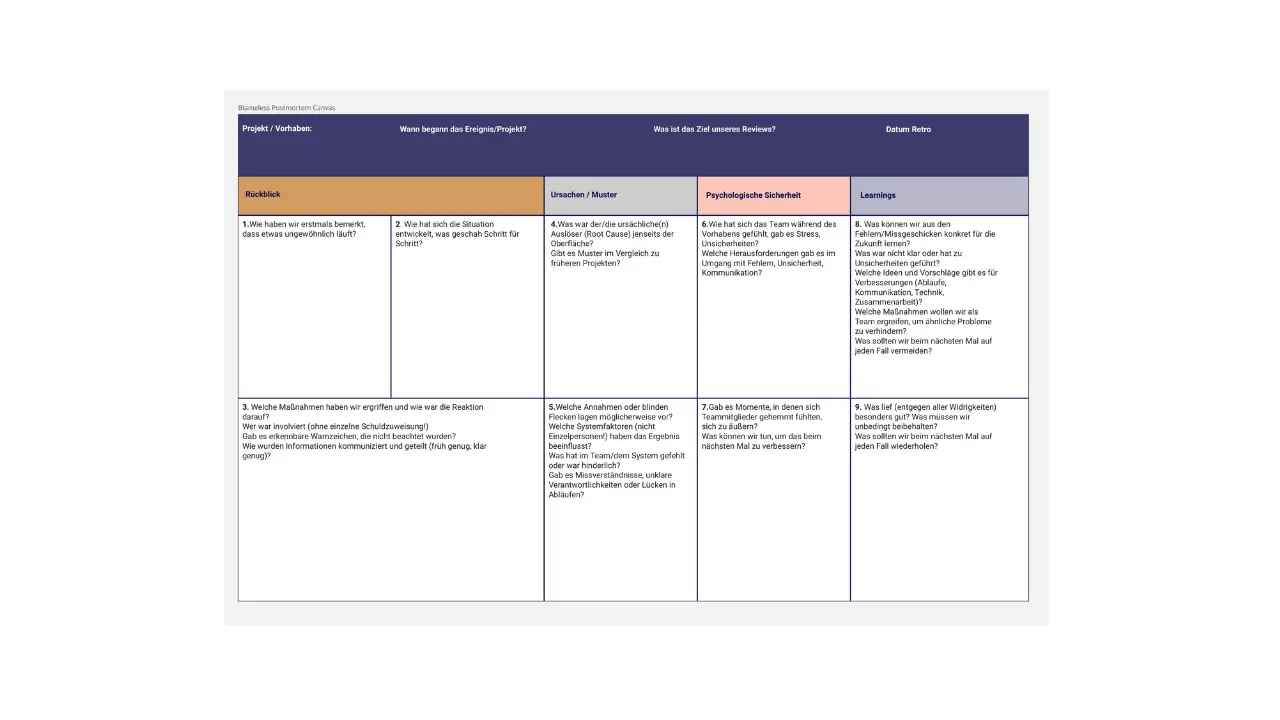 Efficacité temporelle : L'utilisation d'un modèle préconçu permet de gagner du temps lors de la préparation de la rétrospective. Les équipes peuvent ainsi se concentrer davantage sur la discussion que sur l'organisation, rendant le processus plus efficace.
