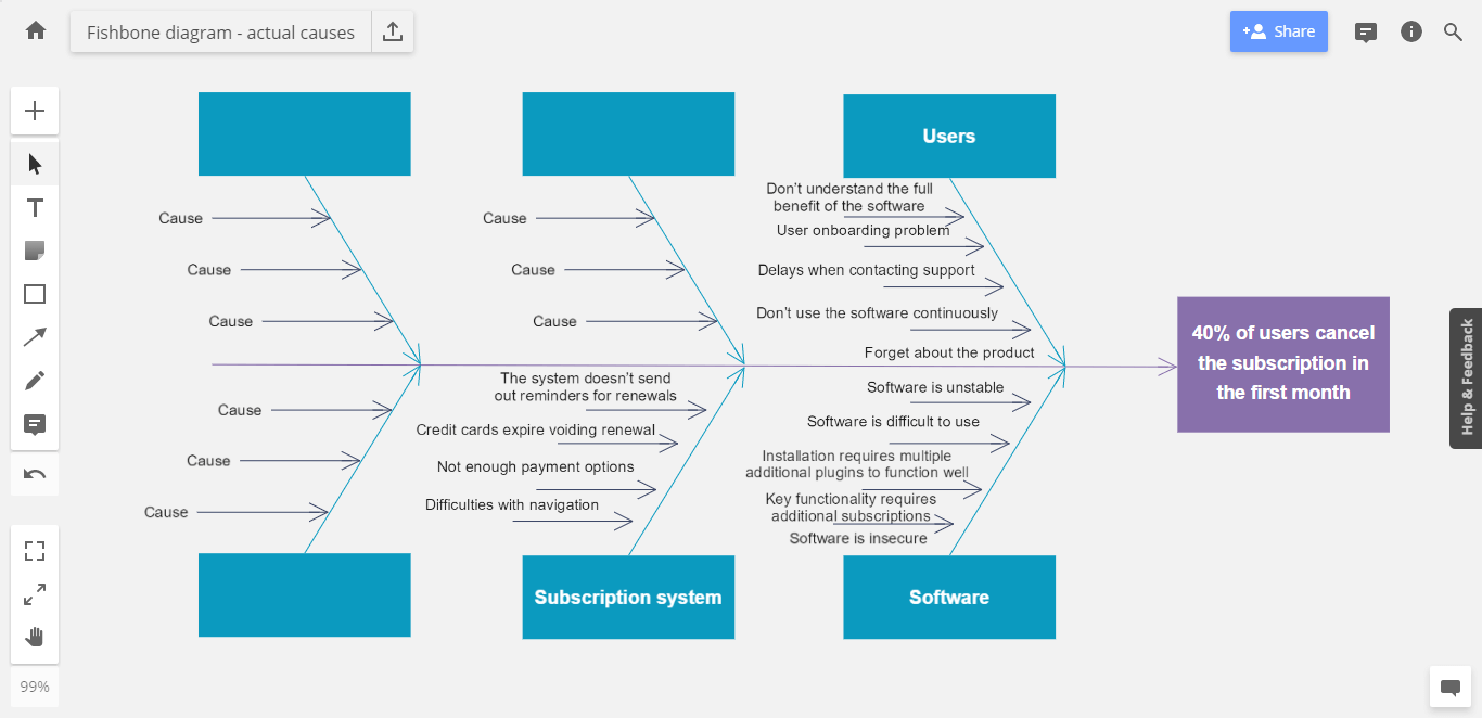 Quando il diagramma è pronto per l'uso, si inizia con la definizione del problema. Questa definizione, altrimenti nota come dichiarazione del problema, si trova in testa al diagramma. Deve essere il più chiaro e conciso possibile per trovare la soluzione giusta. Ad esempio, nel diagramma sottostante, il problema principale è che "il 40% degli utenti annulla l'abbonamento nel primo mese". Questa affermazione descrive chiaramente il problema e offre un solido punto di partenza per trovare una soluzione.
