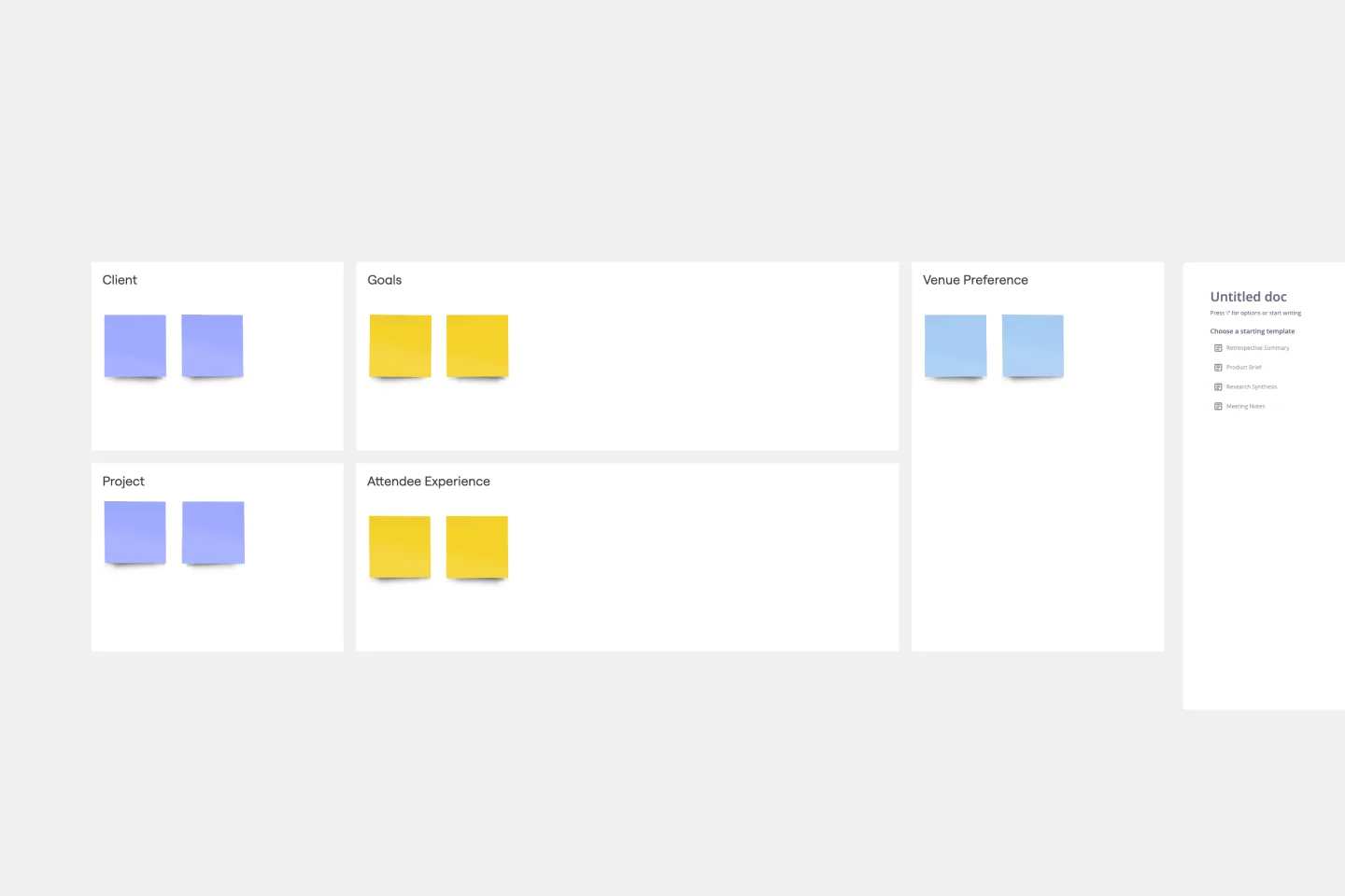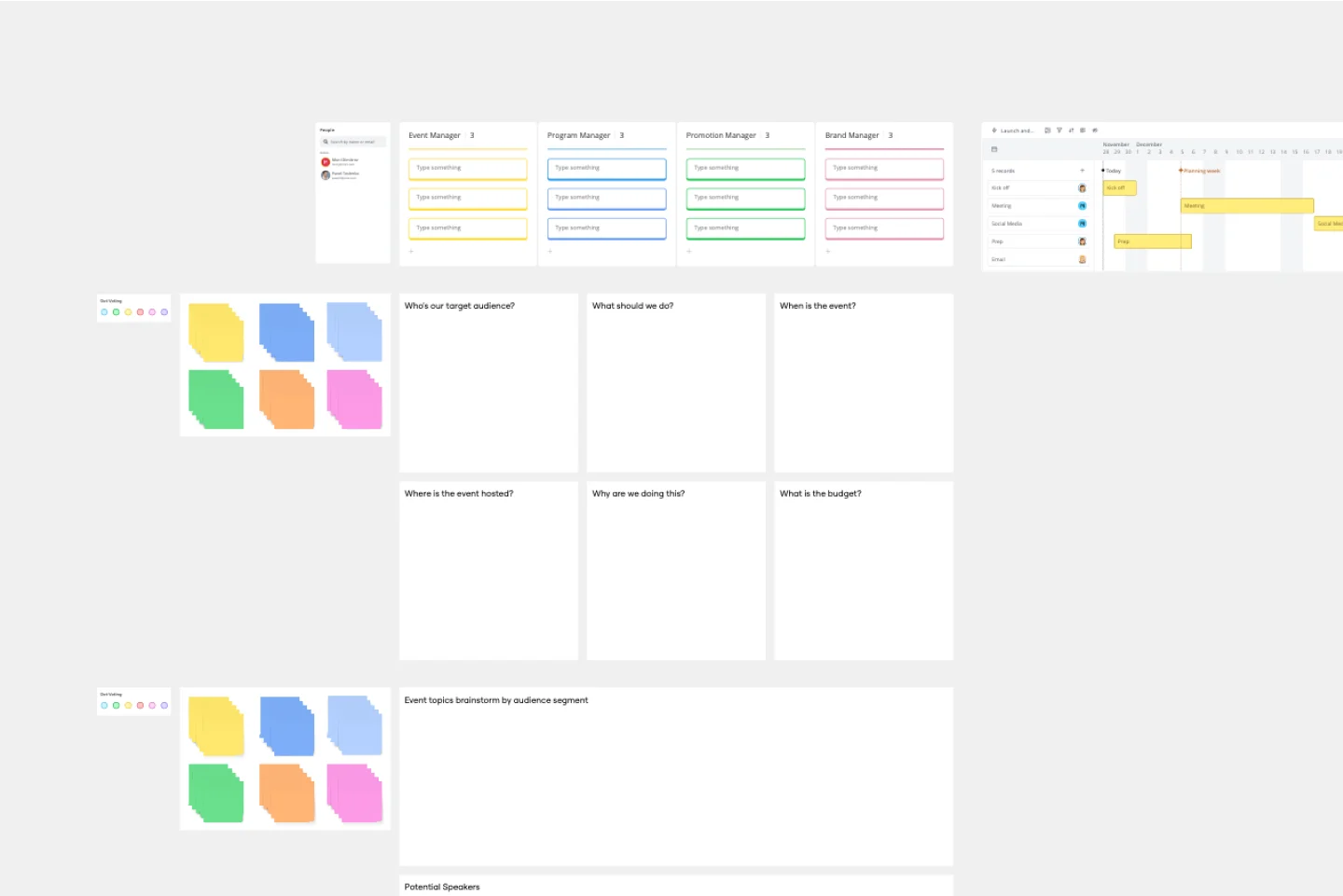 La personalizzazione del tuo piano eventi è facile con il semplice modello di Miro. Il nostro strumento di lavagna digitale è la tela perfetta per creare e condividere con il tuo team. Inizia selezionando il modello di event planning, dopodiché segui i seguenti passaggi per crearne uno tuo.