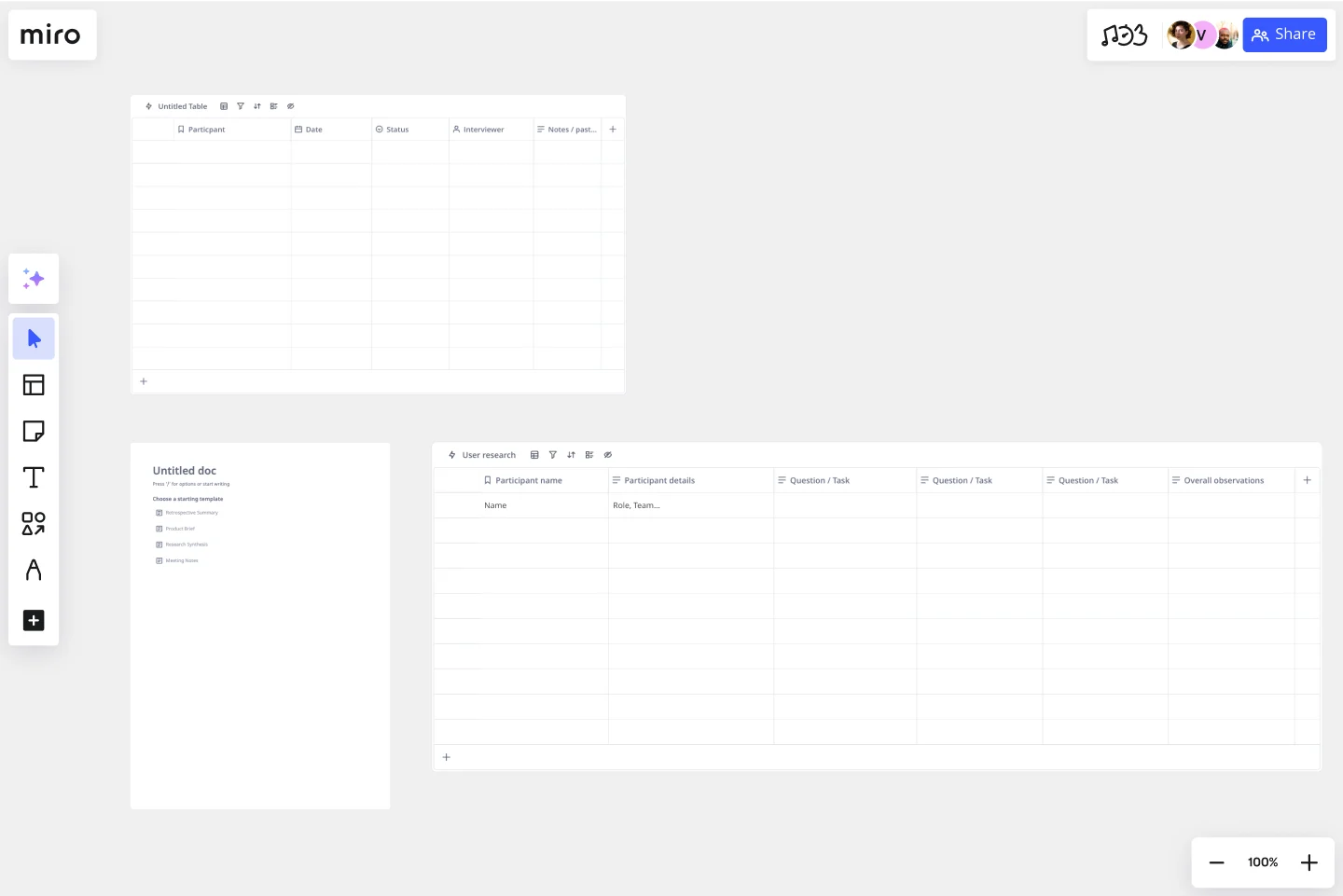 Prendi appunti. Le colonne e le righe del modello di ricerca utente sono personalizzabili e possono essere rinominate per registrare elementi come gli obiettivi dell'osservazione, i dettagli del tester e le emozioni che emergono durante la conversazione. Queste note possono essere utili anche per le persone che non possono partecipare alla sessione.