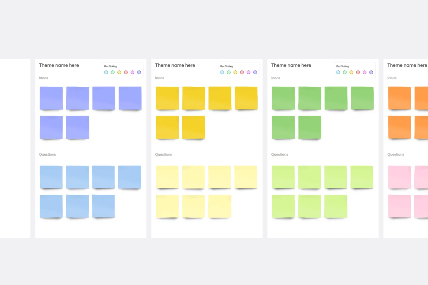 アフィニティ ダイアグラムを使用すると、ブレインストーミング セッションから得られた情報を生成、整理、統合できます。プロダクトの開発、複雑な問題の解決、プロセスの確立、問題の分析など、さまざまな場面で役立つシンプルなフレームワークです。個々のチームメンバーがアイデアを出し合い、意見を共有するための貴重な機会を与えてくれます。また、ブレインストーミングに限らず、合意を得る必要がある時やアンケート結果の分析時にも最適なテンプレートであり、ツールです。