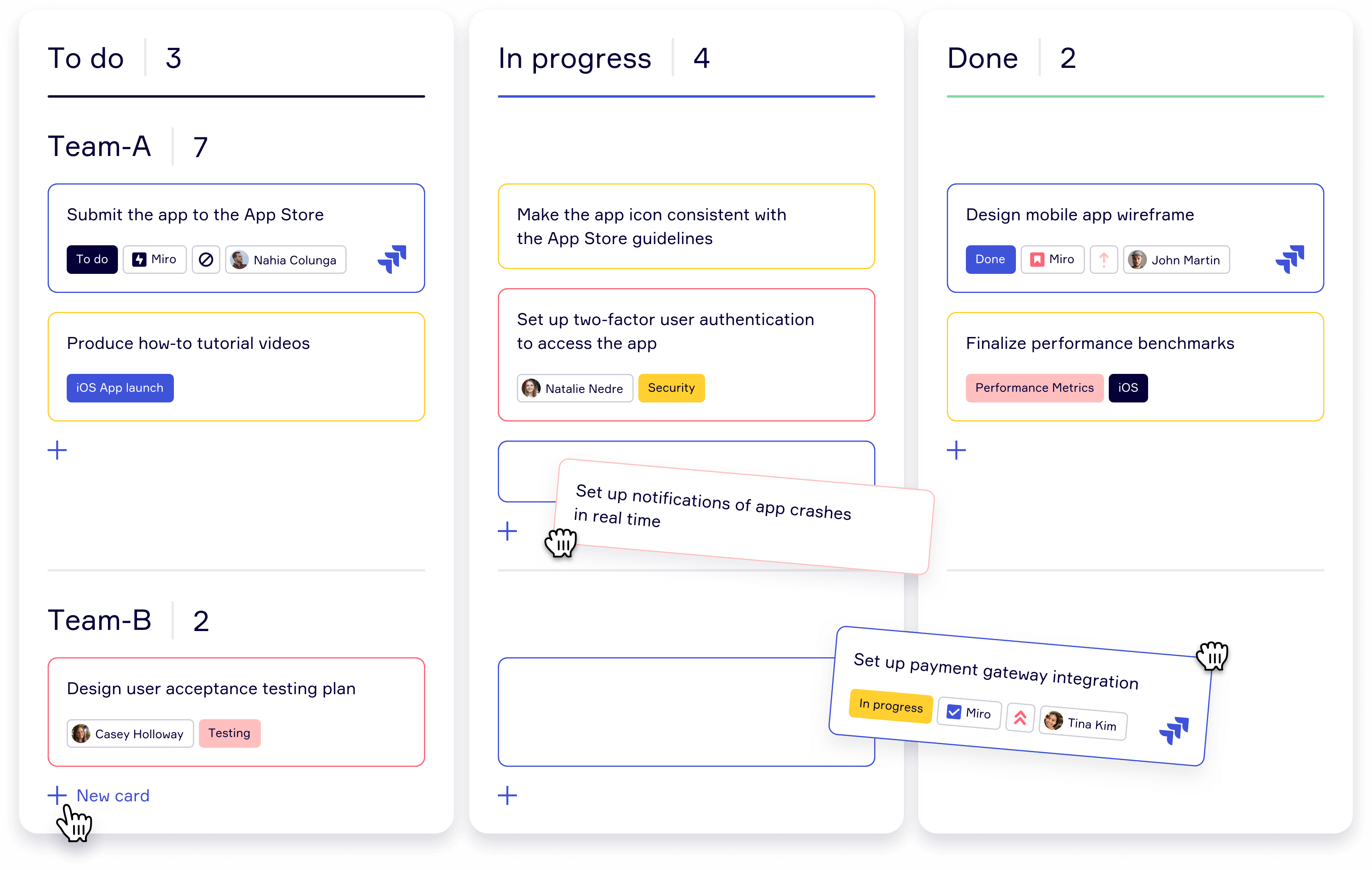 Use Miro’s powerful cards to add tasks with just a few clicks. Avoid wasting time with complicated workflows, and simplify your process using the default setup or customize the Kanban board according to your needs.