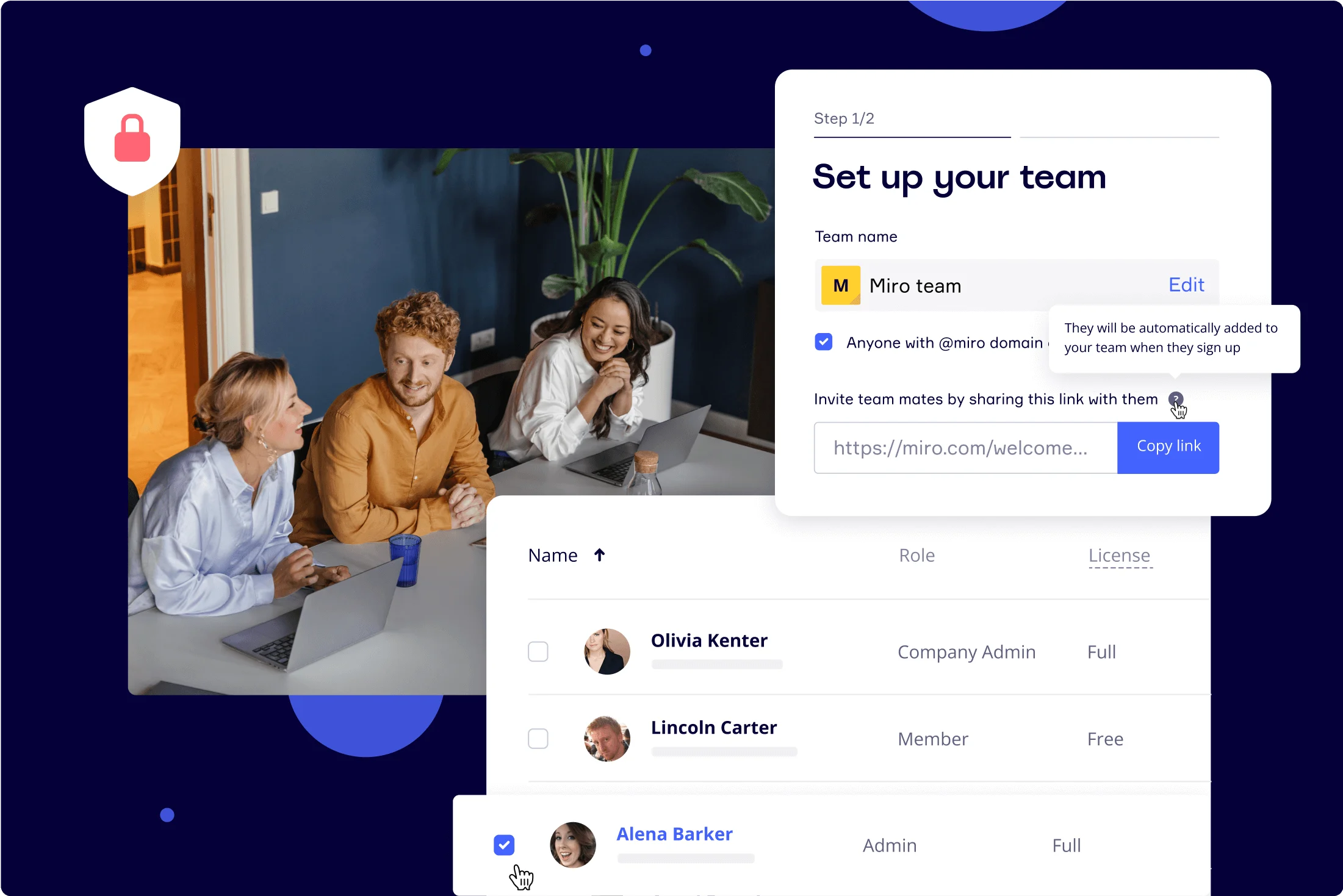 중앙에서 단 몇 번의 클릭으로 모든 사용자의 권한을 규모에 맞게 관리할 수 있습니다. 역할 및 라이선스 할당, 팀 간 사용자 이동, 공유 설정 변경 등의 일괄 작업으로 시간을 절약하세요.