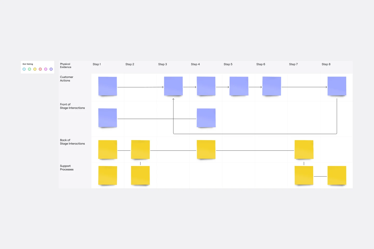 Service blueprints, voor het eerst geïntroduceerd door G. Lynn Shostack in 1984, maken het mogelijk om de stappen in een serviceproces te visualiseren vanuit het perspectief van de klant. Service blueprints zijn nuttige tools voor het begrijpen en ontwerpen van een service-ervaring - en het vinden van manieren om deze te verbeteren. Service blueprint diagrammen maken het voor teams eenvoudiger om nieuwe processen te ontwerpen of bestaande processen te verbeteren. Om een service blueprint te maken, map je elk proces en elke actor die bijdraagt tot de klantervaring, van interne medewerkers tot externe verkopers.