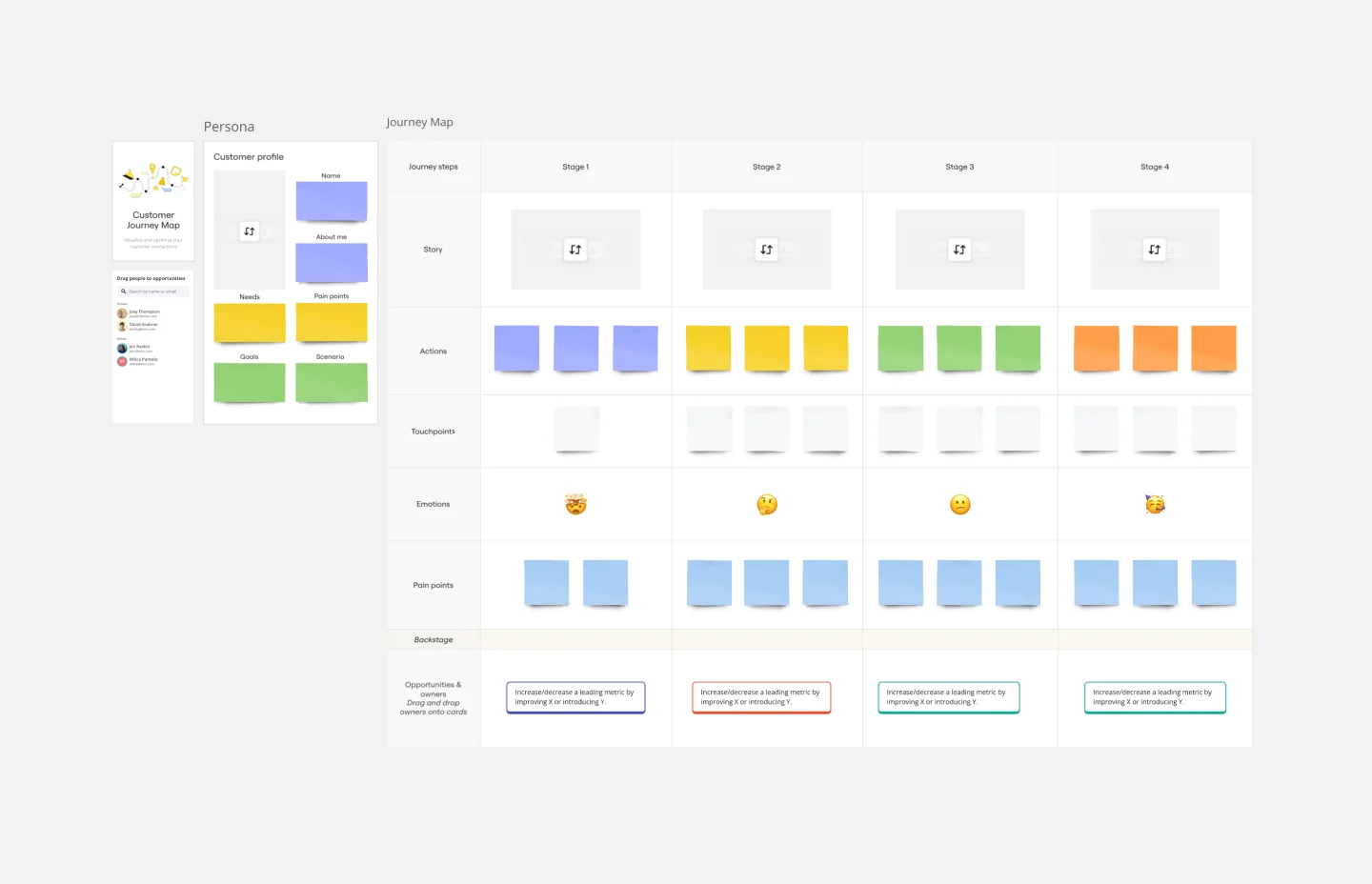 Na podstawie przeprowadzonych badań możesz teraz wykorzystać te informacje do zmapowania wszystkich możliwych punktów styku, na które natknie się Twój klient. Skorzystaj z szablonu Mapa podróży użytkownika, aby dodać wyniki, które chcesz, aby klient osiągnął, a następnie przeprowadź mapowanie wszystkich kroków, które muszą podjąć, aby osiągnąć te wyniki.