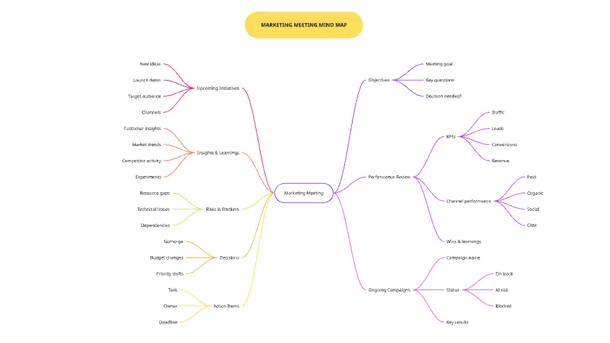 Szablon mapy myśli to dobrze zorganizowane, gotowe do użycia narzędzie graficzne na Twoje następne burze mózgów. Idealny dla osób uczących się wizualnie, ten sposób tworzenia diagramów unika sztywności innych technik ideacji, skupiając się raczej na swobodnym kojarzeniu koncepcji i pomysłów – łącząc kreatywne i logiczne myślenie.