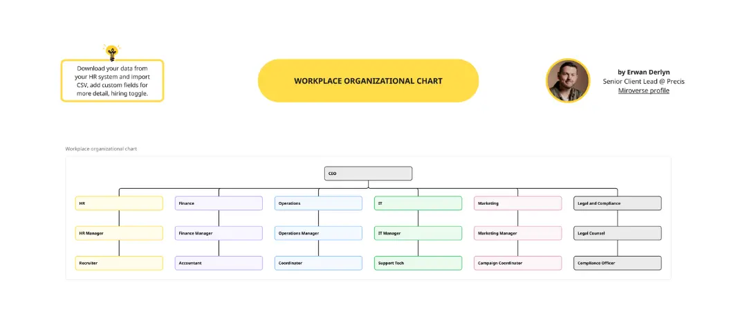 Pracownicy są Twoim najważniejszym zasobem. Narzędzia do planowania organizacyjnego od Miro są odpowiednie dla zespołów każdej wielkości i pomagają szybko zobaczyć pełną perspektywę. Zainspiruj się jednym z naszych przykładowych schematów organizacyjnych i przygotuj swój zespół do pracy.