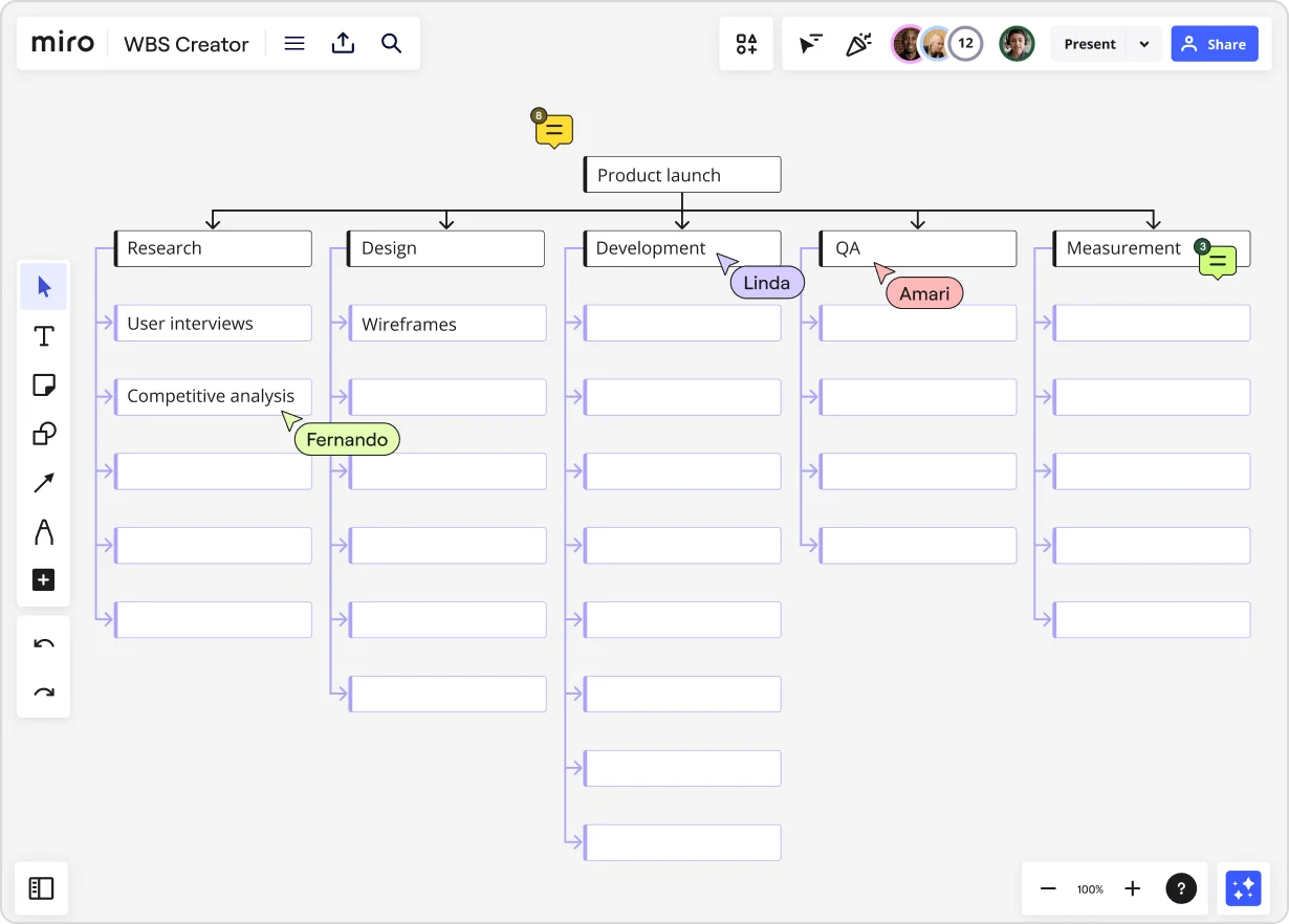 With Miro, you’re not just creating a WBS; you’re building a dynamic project plan that’s easy to manage, update, and share.