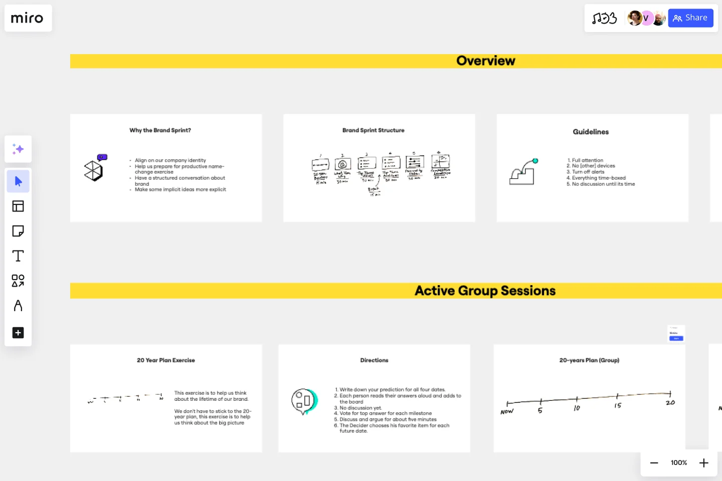 Pessoas usam um template de sprint de marca para construir um perfil para a organização. Os sprints de marca permitem que você reflita sobre o seu roadmap para o futuro, seus valores, seus públicos e por que sua empresa existe em primeiro lugar.