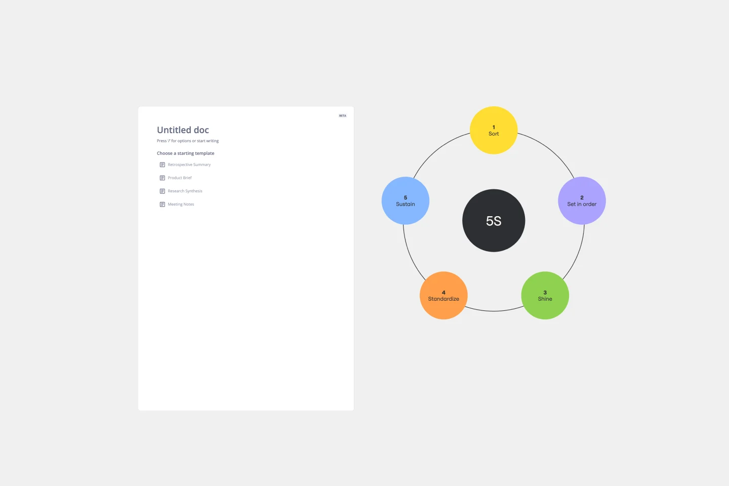 O template 5S oferece um framework sistemático baseado na renomada metodologia 5S: Ordenar, Definir em ordem, Shine, Padronizar e Sustentar. Originalmente derivado das práticas de fabricação japonesas, este template fornece instruções claras para ajudar os times a otimizar os espaços de trabalho. Um benefício de destaque do uso deste template é a capacidade de melhorar drasticamente a eficiência. Cada recurso e ferramenta está posicionado para maximizar a produtividade ao orientar os usuários na desorganização e organização, reduzindo o desperdício de tempo e aprimorando o fluxo de trabalho geral.