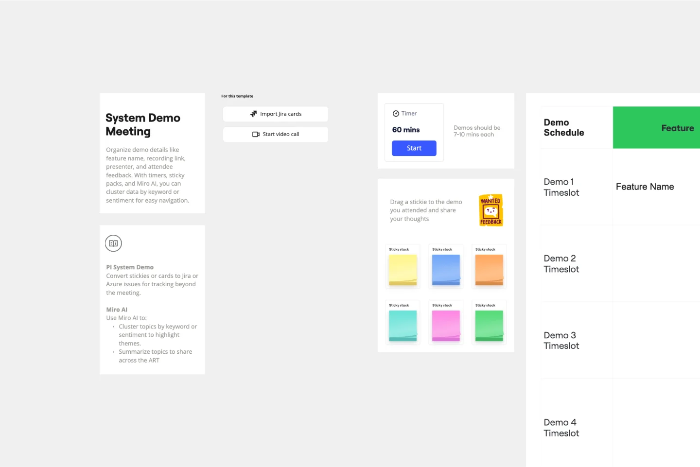O template System Demo Meeting SAFe é projetado para otimizar e aprimorar o processo de demonstração do trabalho integrado dos times ágeis. Este template faz parte da coleção de templates inteligentes da Miro, que utiliza ferramentas de IA e interativas para facilitar fluxos de trabalho eficientes e envolventes. A System Demo Meeting é um evento crítico no Scaled Agile Framework (SAFe), proporcionando uma plataforma para que os times mostrem seu progresso, obtenham feedback e alinhem os próximos passos.