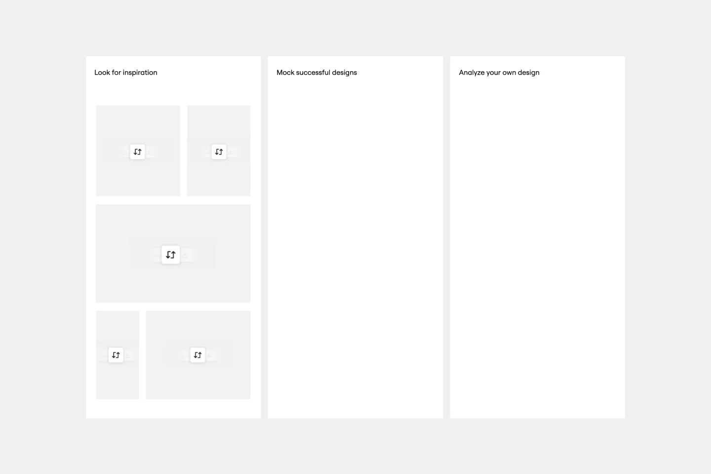 Fazer sua lição de casa (ou seja, a pesquisa) é um passo fundamental no seu processo de design, e a abordagem Look, Mock, Analyze ajuda você a examinar, estruturar e agilizar essa etapa. Com essa poderosa ferramenta, você poderá identificar seus pontos fortes e fracos, o que fez certo ou errado, e se utilizou seu tempo de forma eficiente. Nosso template Look, Mock, Analyze facilita muito a descoberta de inspirações, a criação de mockups e a obtenção de feedback — você pode começar configurando seu board em menos de um minuto.