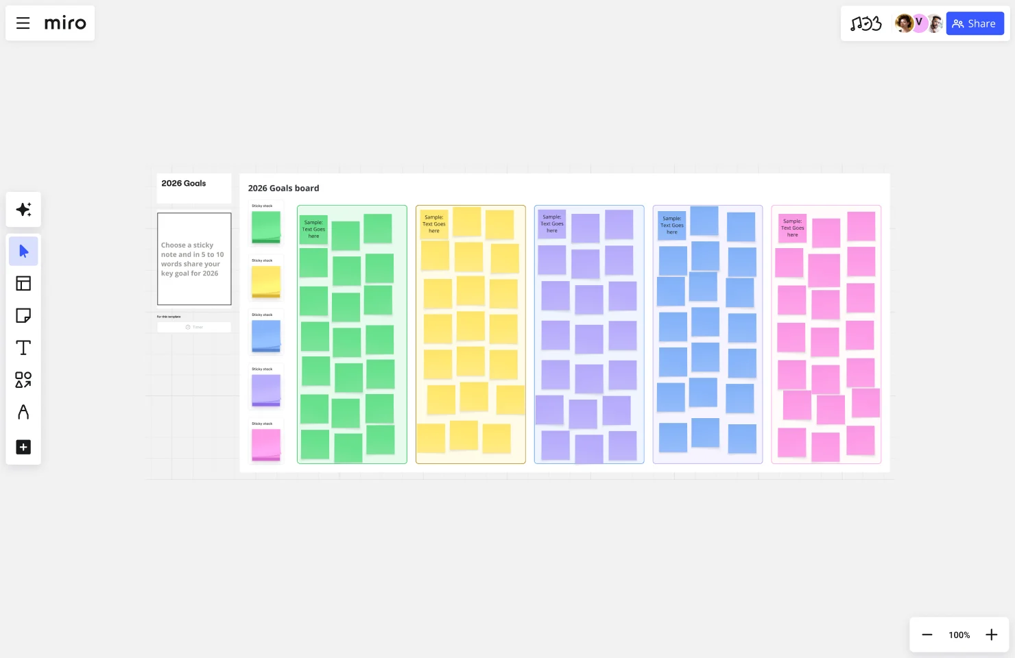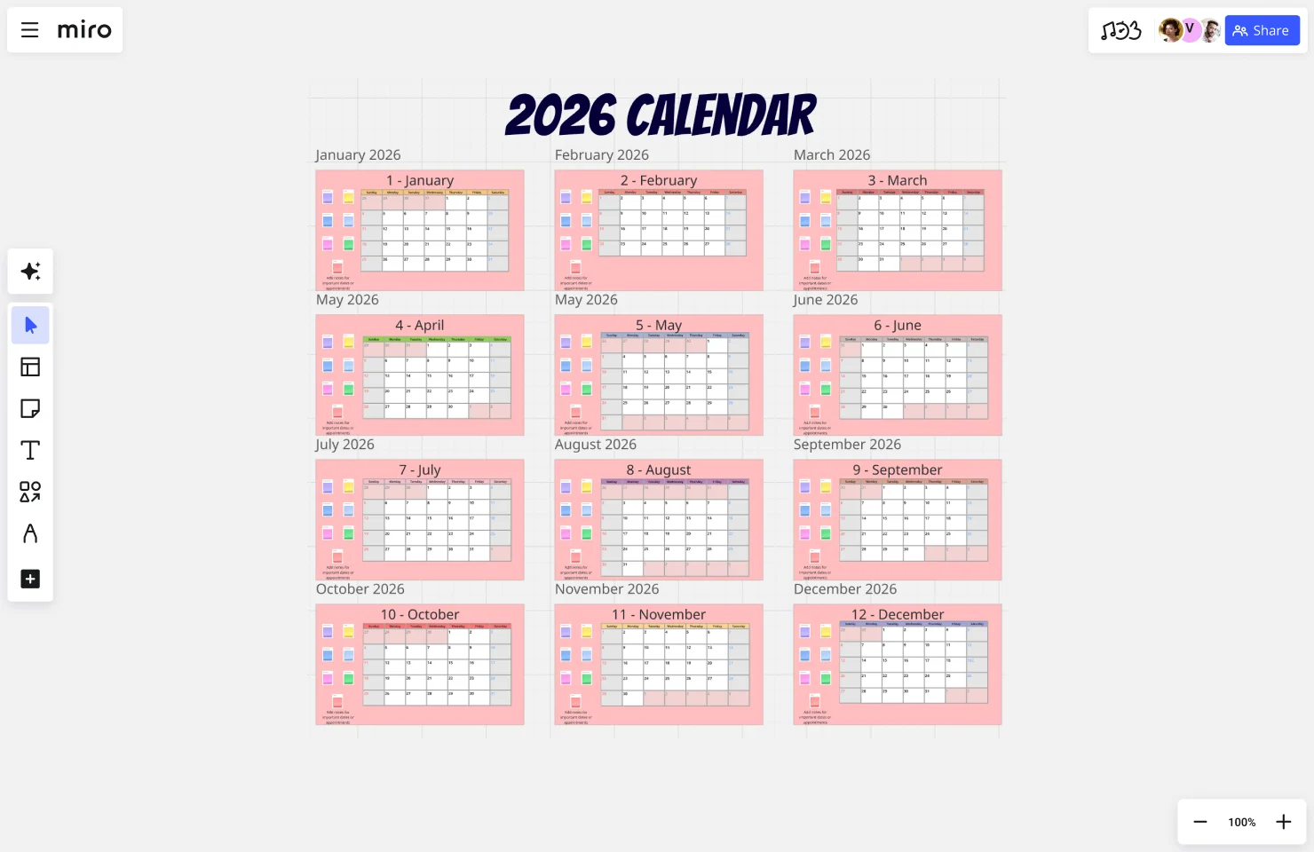 The 2026 Calendar template takes a more visual approach to year planning. Instead of a traditional grid, this template uses Miro's infinite canvas to create a flexible planning space where you can arrange months, quarters, and key initiatives however makes sense for your team.