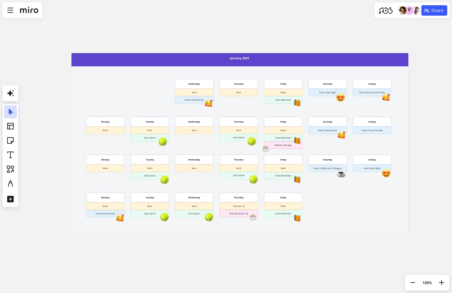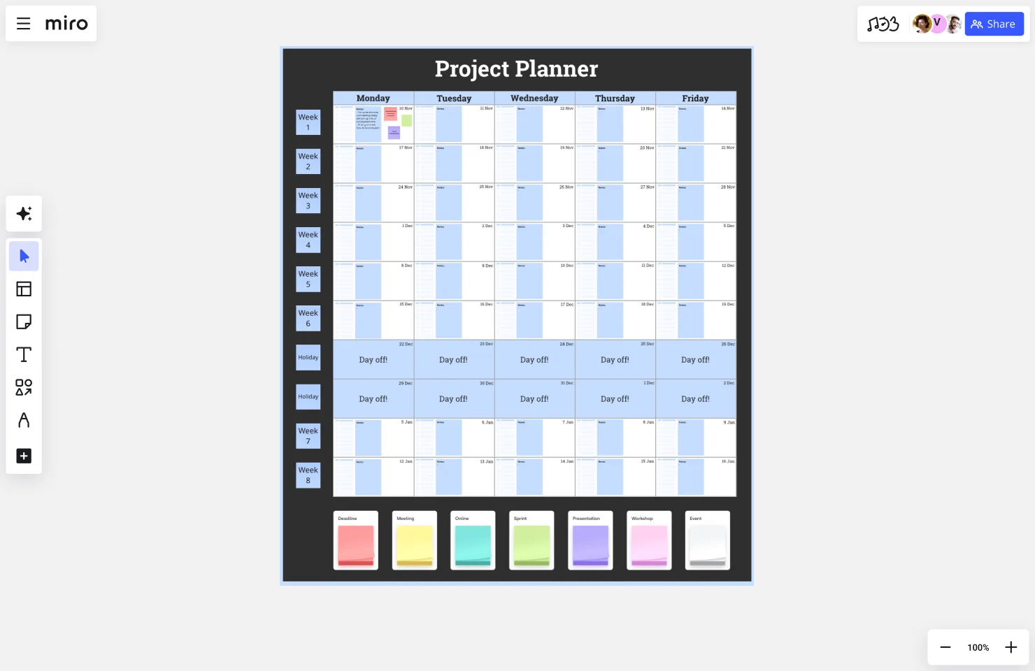That's where visual calendar planning in Miro makes a difference. Instead of scattered due dates and disconnected task lists, your entire team sees the full picture: project milestones, sprint cycles, campaign launches, and capacity planning — all on one shared canvas that updates in real time.