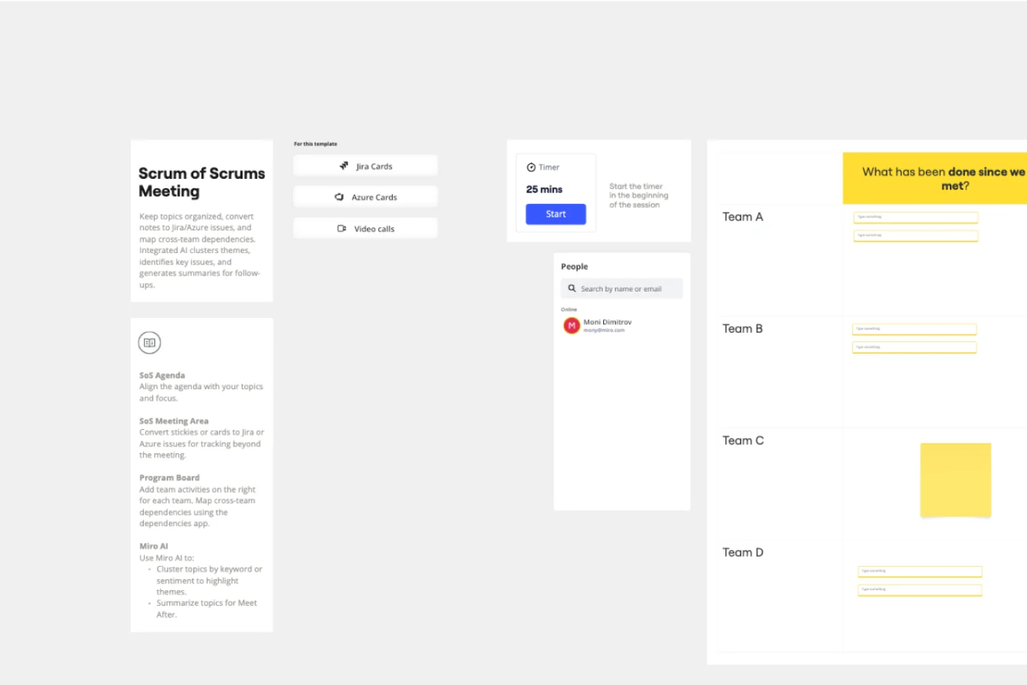 The ART Sync Meeting SAFe Template streamlines your Agile Release Train (ART) sync meetings, combining the Product Owner (PO) Sync and Scrum of Scrums into a single, efficient process. This intelligent template helps you capture meeting insights, document objectives, monitor team progress, and assess program risks. With integrated Miro AI, you can group topics by keyword or sentiment, spotlight key themes, and create summaries for follow-up discussions.