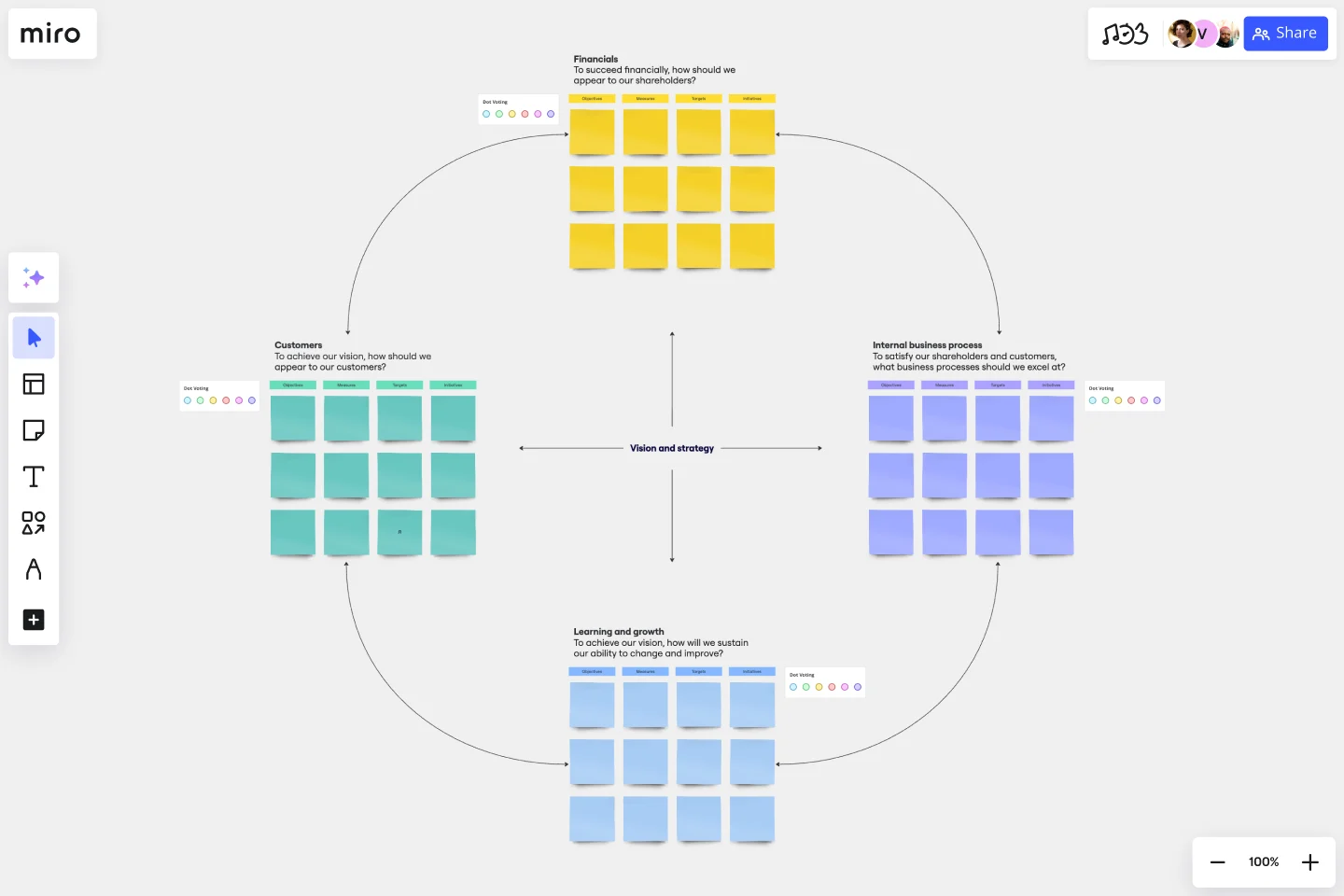 Making your balanced scorecard is easy with Miro’s template, and your team can collaborate on creating it. Miro is the perfect tool to create and share your balanced scorecard (BSC). Get started right away by selecting this balanced scorecard template. Then, follow these steps: