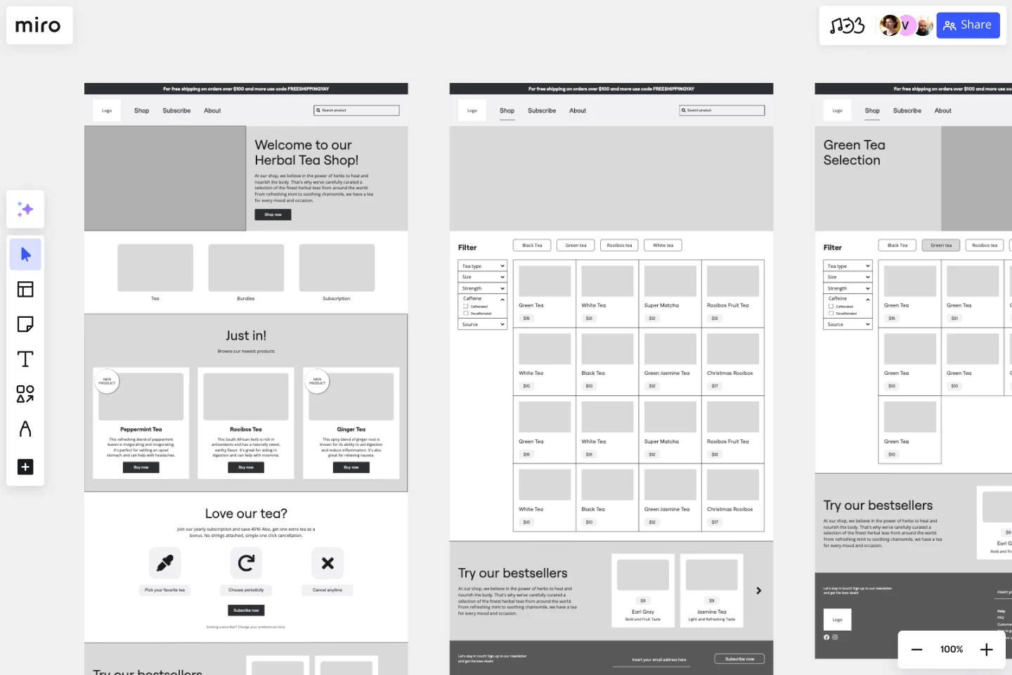 Iterate and refine: Continuously iterate on your wireframe based on feedback. Use Miro’s infinite canvas to mock up the flow between your website pages and have a comprehensive overview of your website layout.