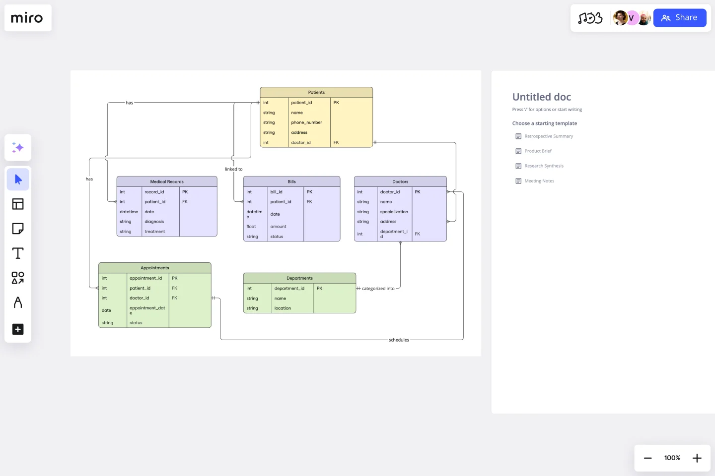 Collaboration: Miro’s platform facilitates collaboration, allowing multiple users to contribute to the ERD simultaneously, which is particularly useful for remote teams.