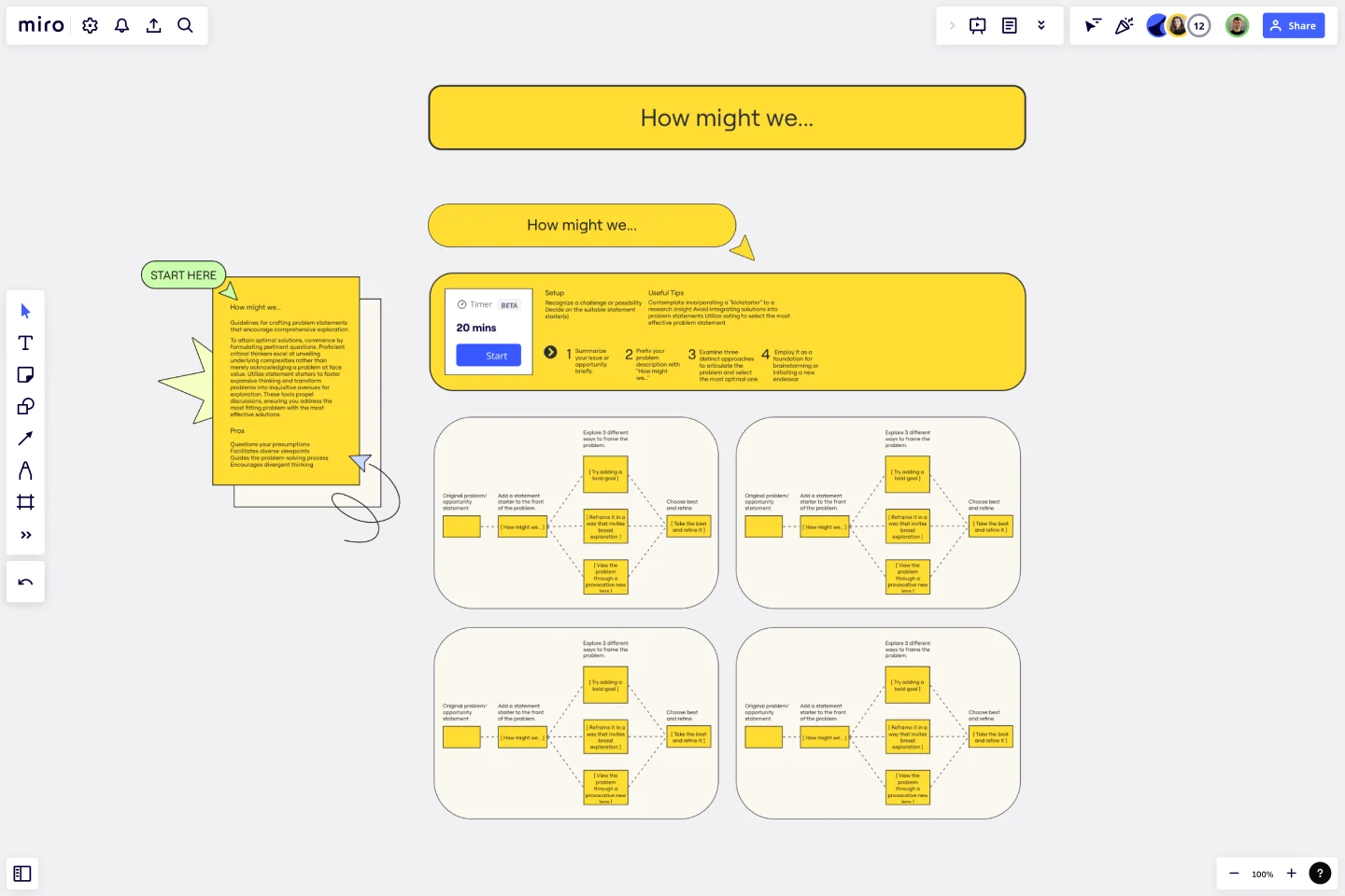 Statement starters like the How Might We Template can help you explore more open-ended problems. These tools allow you to approach problems from different angles and consider a wider range of potential solutions. By doing so, you can have more productive discussions and ultimately find the most effective solutions to your problems.