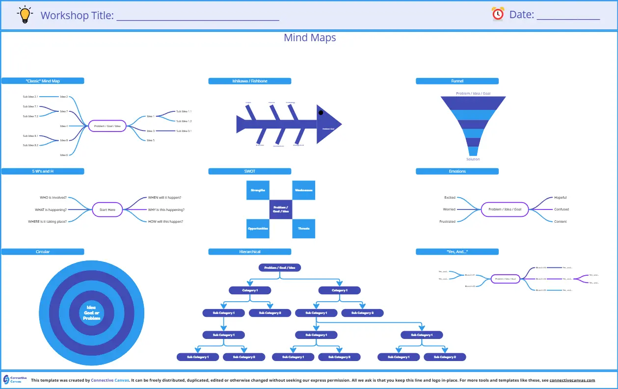 The mind map template is a well-organized, ready-to-use graphic tool for your next brainstorming session. Ideal for visual learners, this diagramming method avoids the rigid structure of other ideation techniques, focusing instead on the free association between concepts and ideas — connecting creative and logical thinking.