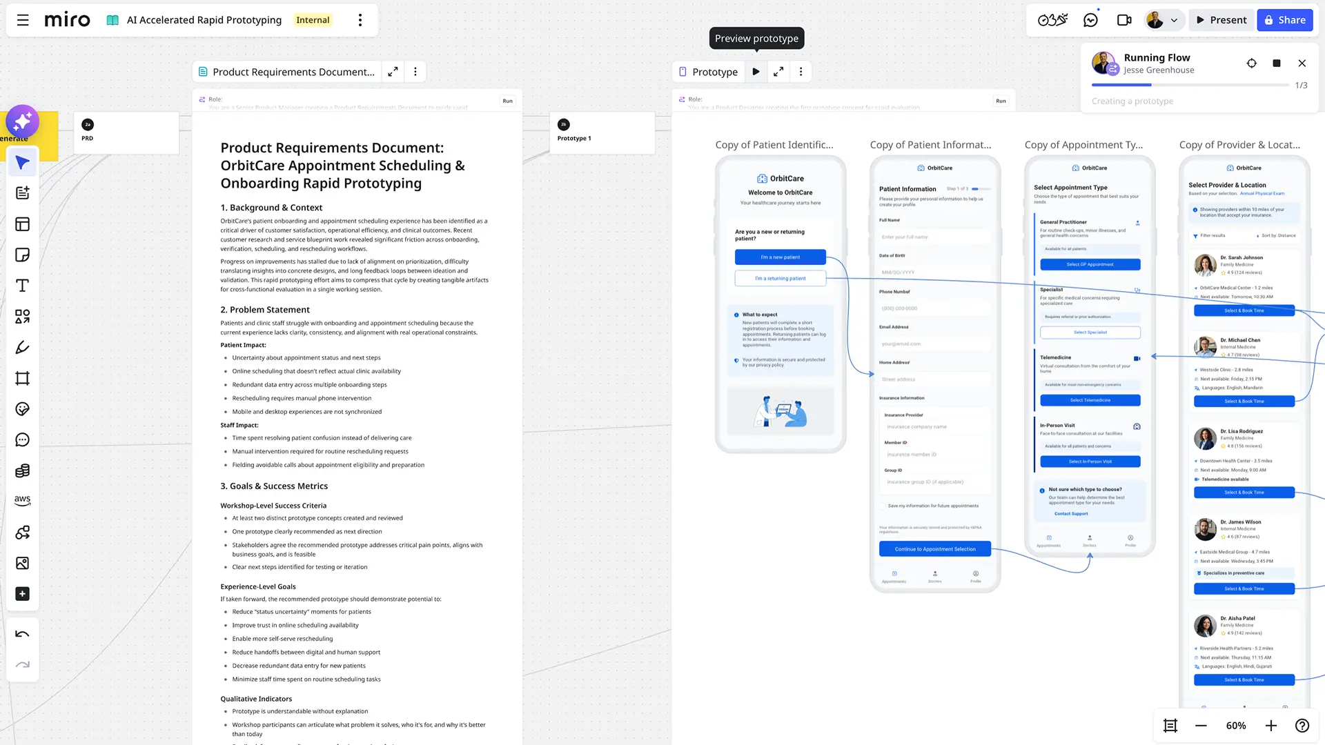 Built with Miro Flows, this end-to-end product development workflow helps you turn rich inputs like customer research, competitive analysis, company knowledge, and regulatory requirements into production-ready outputs such as PRDs, prototypes, technical documentation, diagrams, and leadership-ready presentations, all directly on the canvas.