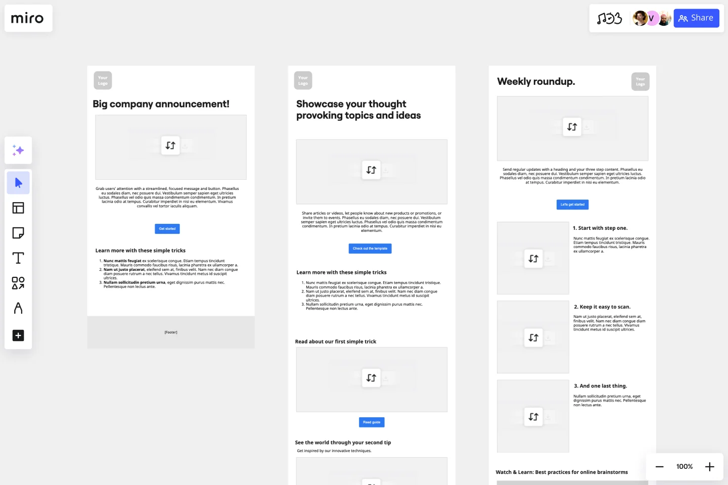 Plan and test your designs. A newsletter template allows you to plan and test the email design before you send it to your subscribers. You can play around with the format, test different images, and add different text to see what works best. If you use Miro’s newsletter template, you can easily share your newsletter designs with your team. They can add comments and feedback directly onto the template so you can easily take their suggestions on board.