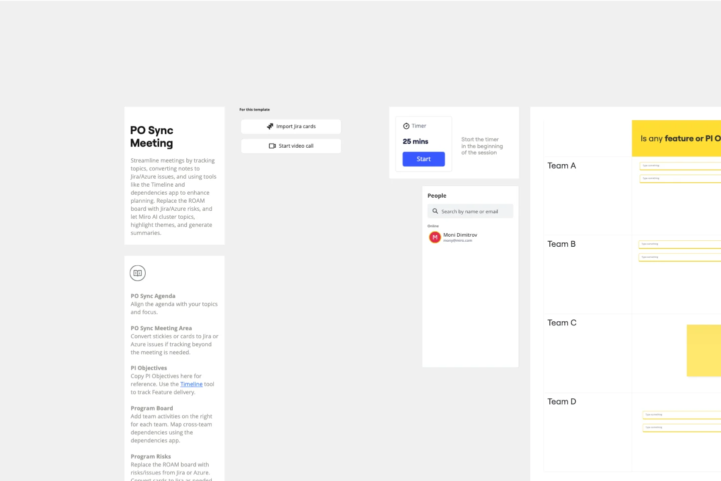 The PO Sync Meeting SAFe Template is designed to streamline Product Owner (PO) sync meetings within the Scaled Agile Framework (SAFe). This intelligent template helps teams stay organized and focused on their objectives by providing a structured format for updating agendas, tracking issues, and managing dependencies. It integrates seamlessly with tools like Jira and Azure, making it easier to convert sticky notes or cards into actionable items and keep track of progress beyond the meeting. The template also leverages Miro AI to cluster topics by keyword or sentiment, highlight key themes, and create summaries for follow-up discussions.