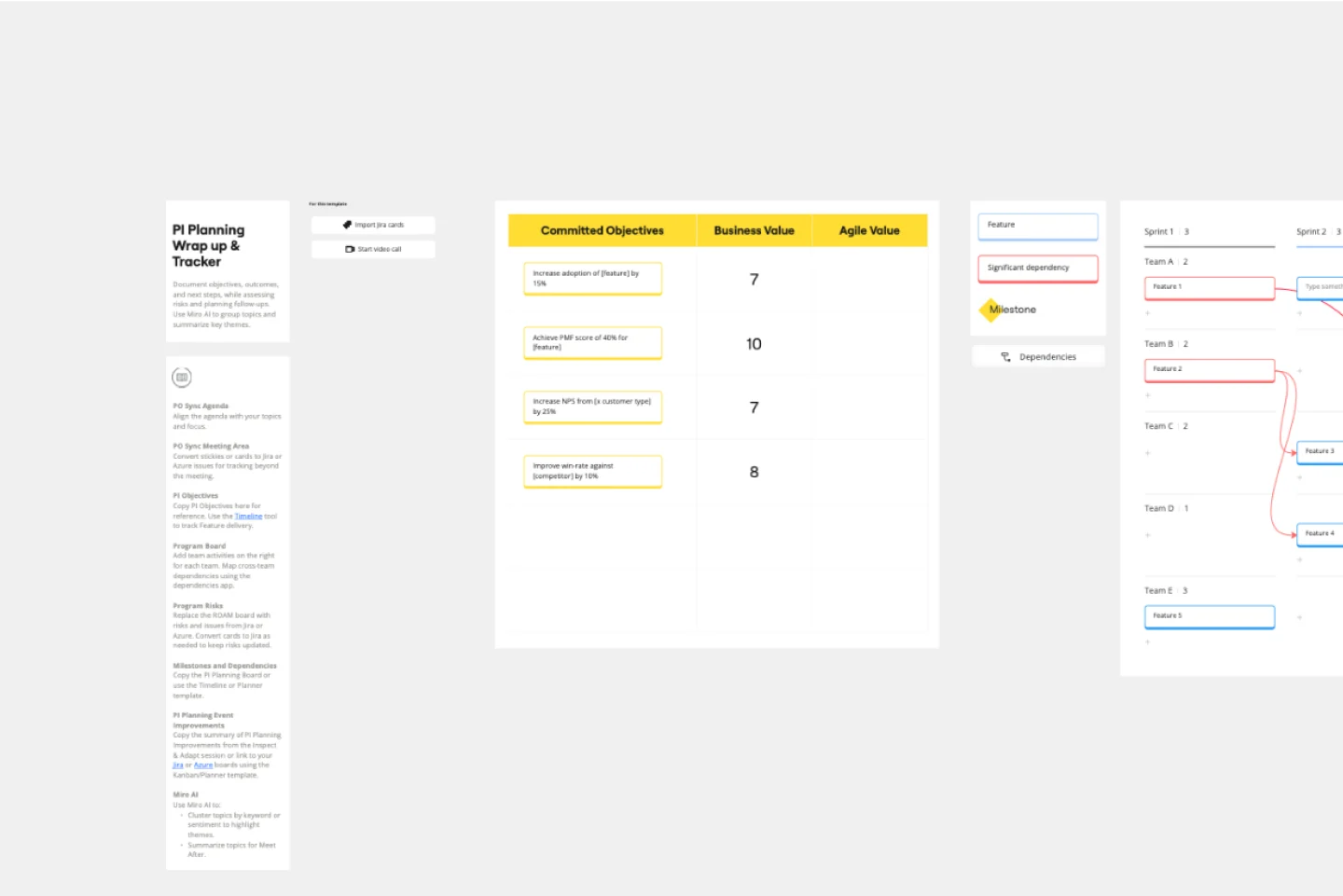 The PI Planning Wrap up & Tracker SAFe Template is a comprehensive tool designed to streamline the post-PI planning process for teams using the SAFe framework. It helps document objectives, meeting outcomes, and future plans, ensuring all critical information is captured and easily accessible. With integrated Miro AI, users can group topics by keyword or sentiment to identify key themes and create summaries for follow-up discussions. This template is particularly beneficial for product managers who need to efficiently track program risks, dependencies, and next steps.