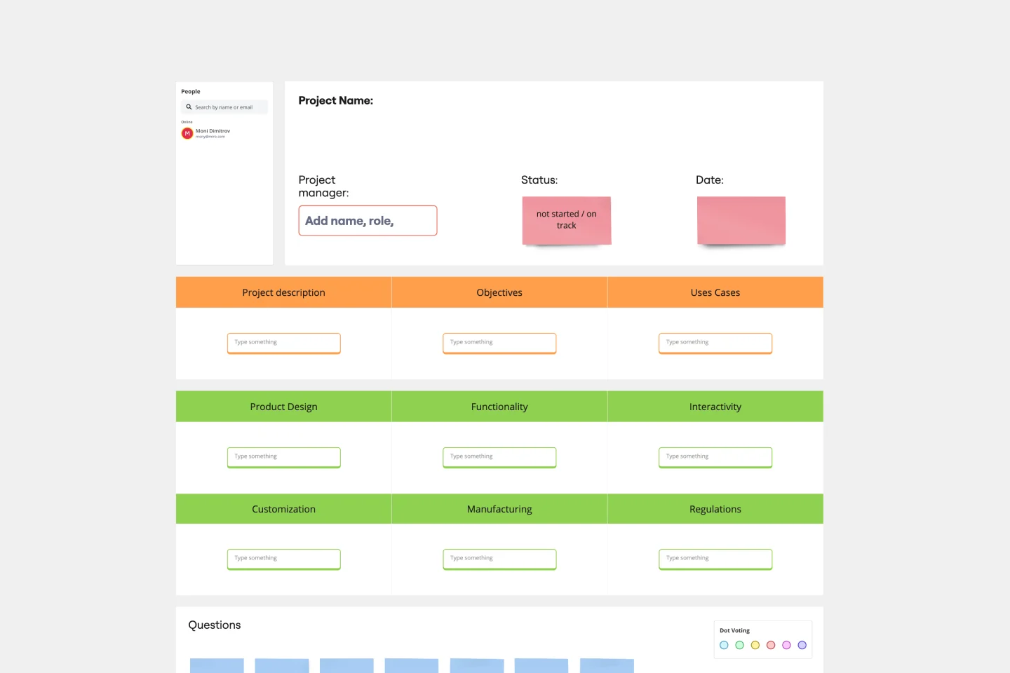 Miro's extensive project management template collection helps you to move projects forward, bring people together, and solve bottlenecks that stand in the way of success. Use one of our many project management examples as a single source of truth for timelines, updates, feedback rounds, and the work itself. Your team (and browser tabs) will thank you.